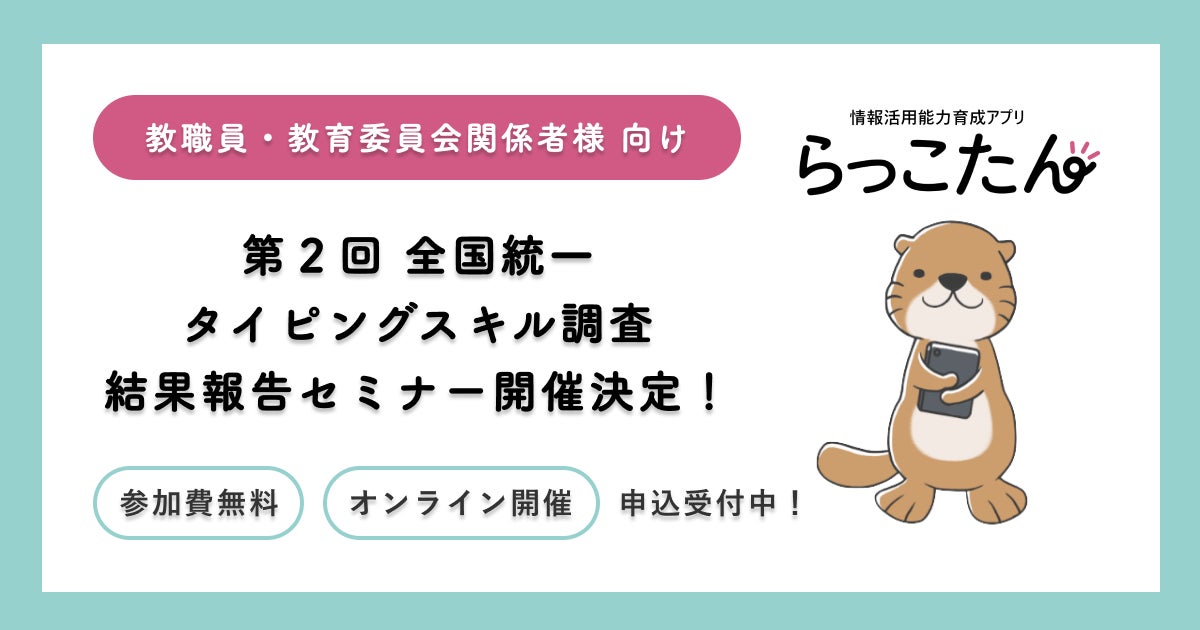 自治体向けサービスを開発する株式会社ミラボ(本社:東京都千代田区、代表取締役:谷川一也、以下「ミラボ」)と、情報モラル教育・プログラミング教育を手がける株式会社教育ネット(本社:神奈川県横浜市、代表取締役:大笹いづみ、以下「教育ネット」)は、共同開発したクラウド型デジタルAI教材「らっこたん」を使用した「第2回全国統一タイピングスキル調査」の結果を報告する教職員・教育委員会 関係者向けセミナーを開催します。