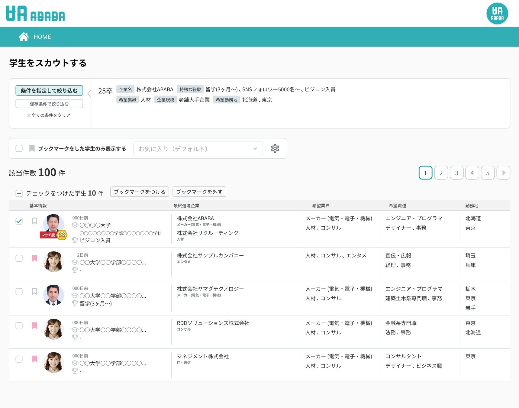 ・利用企業が不採用通知内でABABAへの登録を促すことで、新卒人材の企業間循環を実現。