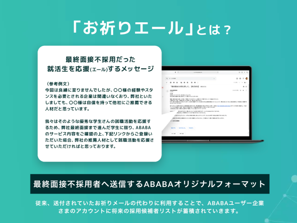 ABABAは企業が就活生に送信する不採用通知=「お祈りメール」を『エール』に変えて送るシステムを作ることで企業のブランドイメージの保持・向上にも貢献しています。