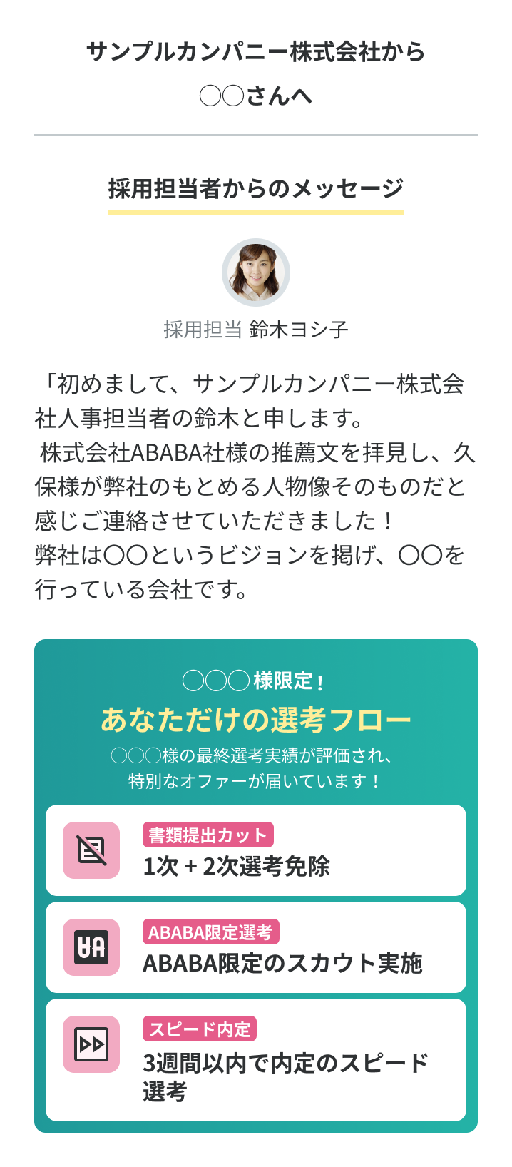 企業は不採用通知の中で 「弊社では採用に至らなかったものの、最終面接まで進んだ実績を評価してくれるサービスがあります。もしよければ活用して最後まで頑張って欲しいです。応援しています。」 という旨の文面をABABAへの登録リンクとともに送付。