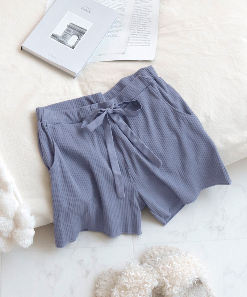 柔らかなリブ生地を使用したショートパンツは裾メロウ&サテンリボンでフェミニンに仕上げました。「ブライラズ」リブレースキャミソールとセットで着用すればおしゃれなルームウェアに早変わり!