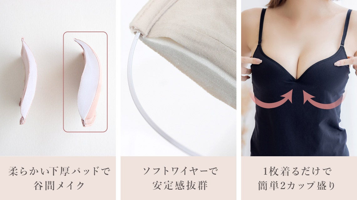 キャミソールに盛りブラの機能をそのまま搭載!ふんわり厚みのある柔らかパットとソフトワイヤーでズレずに盛れるから、着るだけで楽なのに綺麗なバストを実現できます。