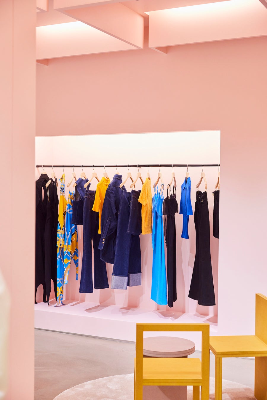 特徴的なピンクの壁や天井照明に包まれる空間は、パトゥのチャーミングでかつエレガント、フレンドリーな雰囲気を醸し出します。幾何学的形態のテーブル、四角いチェア、半円形のラックなどの家具や什器は、店舗のためにオリジナルで制作されました。シンプルな図形的なシルエットを取り入れ、店舗の空間に調和を生み出しています。