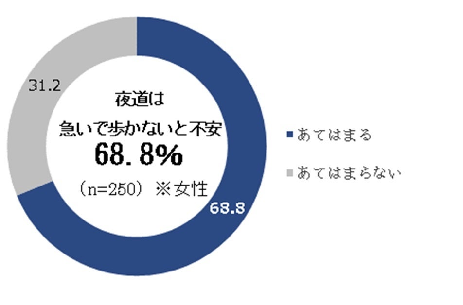 ●「夜道は急いで歩かないと不安」と回答した男性は30.0%である一方、女性は68.8%と2倍以上に上る。