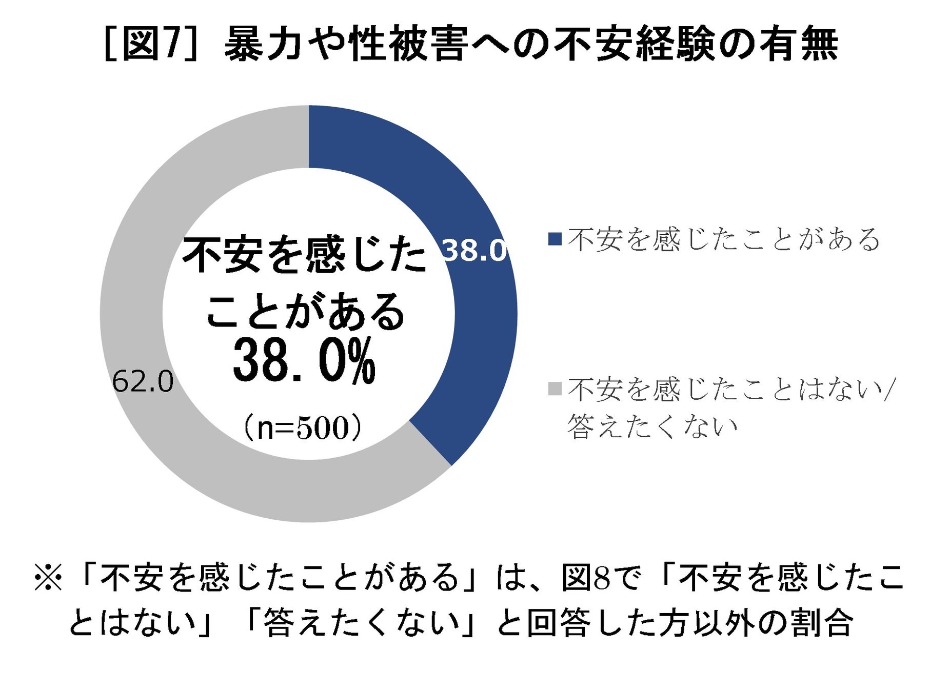 暴力や性被害などの犯罪に関して、巻き込まれる不安を感じたことがあるかと聞くと約4割の人が「不安を感じたことがある」と回答しました【図7】。