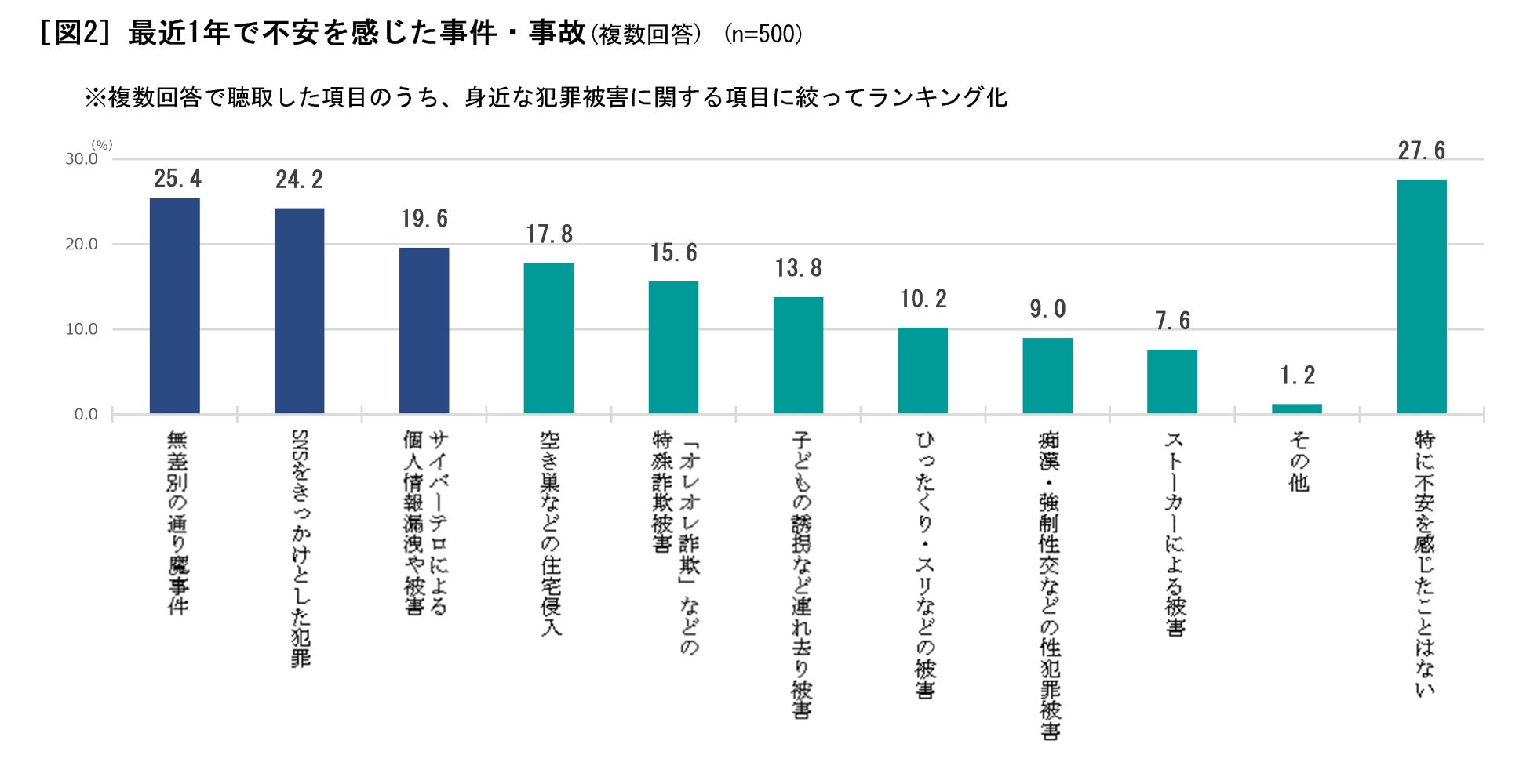 さらに、身近で発生し得るさまざまな事件・事故として、直近1年間で不安を感じたことがあるものについて聞くと、1位「無差別の通り魔事件」(25.4%)、 2位「SNSをきっかけとした犯罪」(24.2%)、3位「サイバーテロによる個人情報漏洩や被害」(19.6%)となり、SNSやネット上での事件・事故へ不安を抱く人も多いことが分かりました。【図2】。
