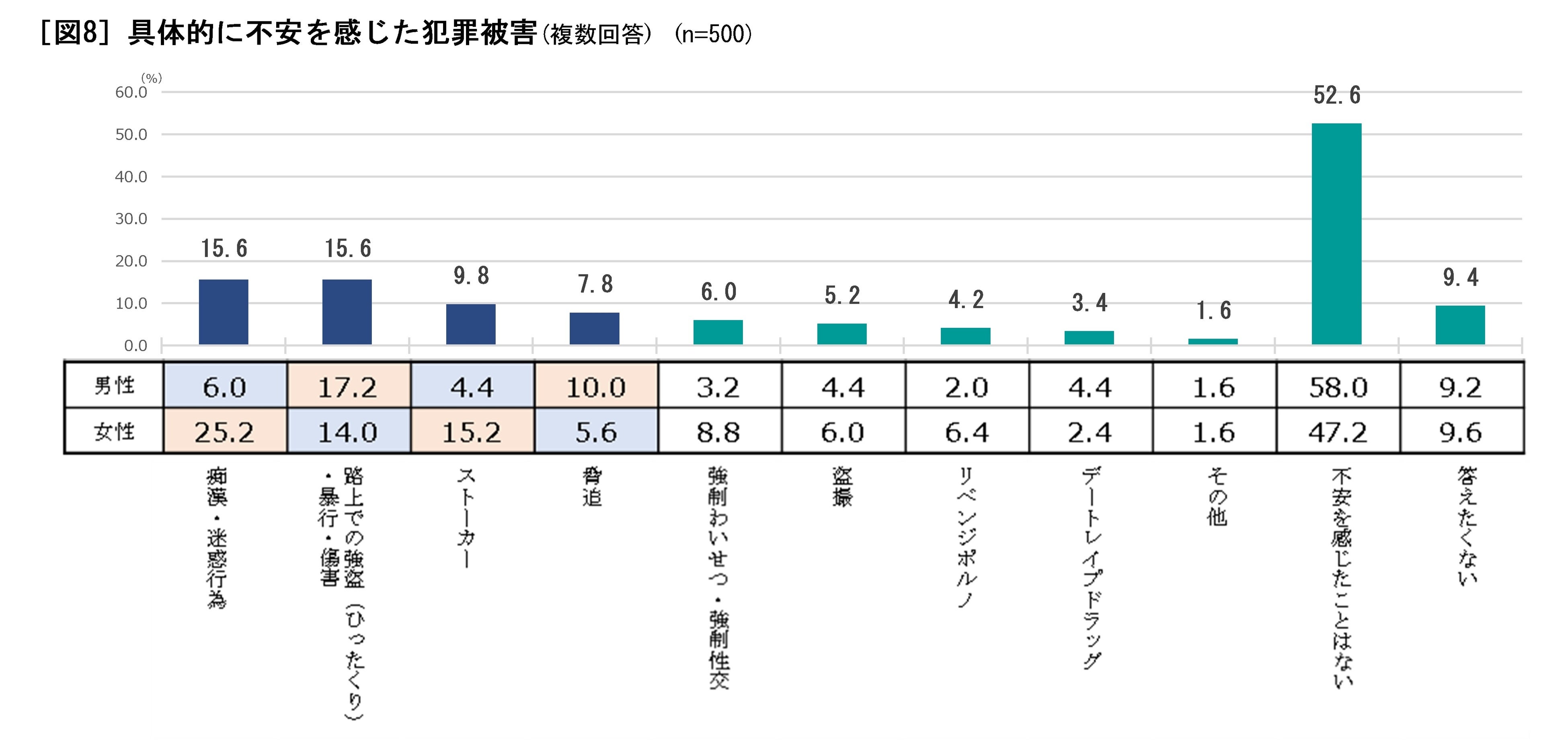 具体的に不安を感じた犯罪の内容は、同率1位で「痴漢・迷惑行為」「路上での強盗(ひったくり)・暴行・傷害」(15.6%)、3位「ストーカー」(9.8%)となりました。女性は「痴漢・迷惑行為」、「ストーカー」などの項目で男性よりも多くの人が不安を感じたことがあるのに対し、男性は「路上での強盗(ひったくり)・暴行・傷害」、「脅迫」などの項目で女性よりも割合が高い結果になりました【図8】。