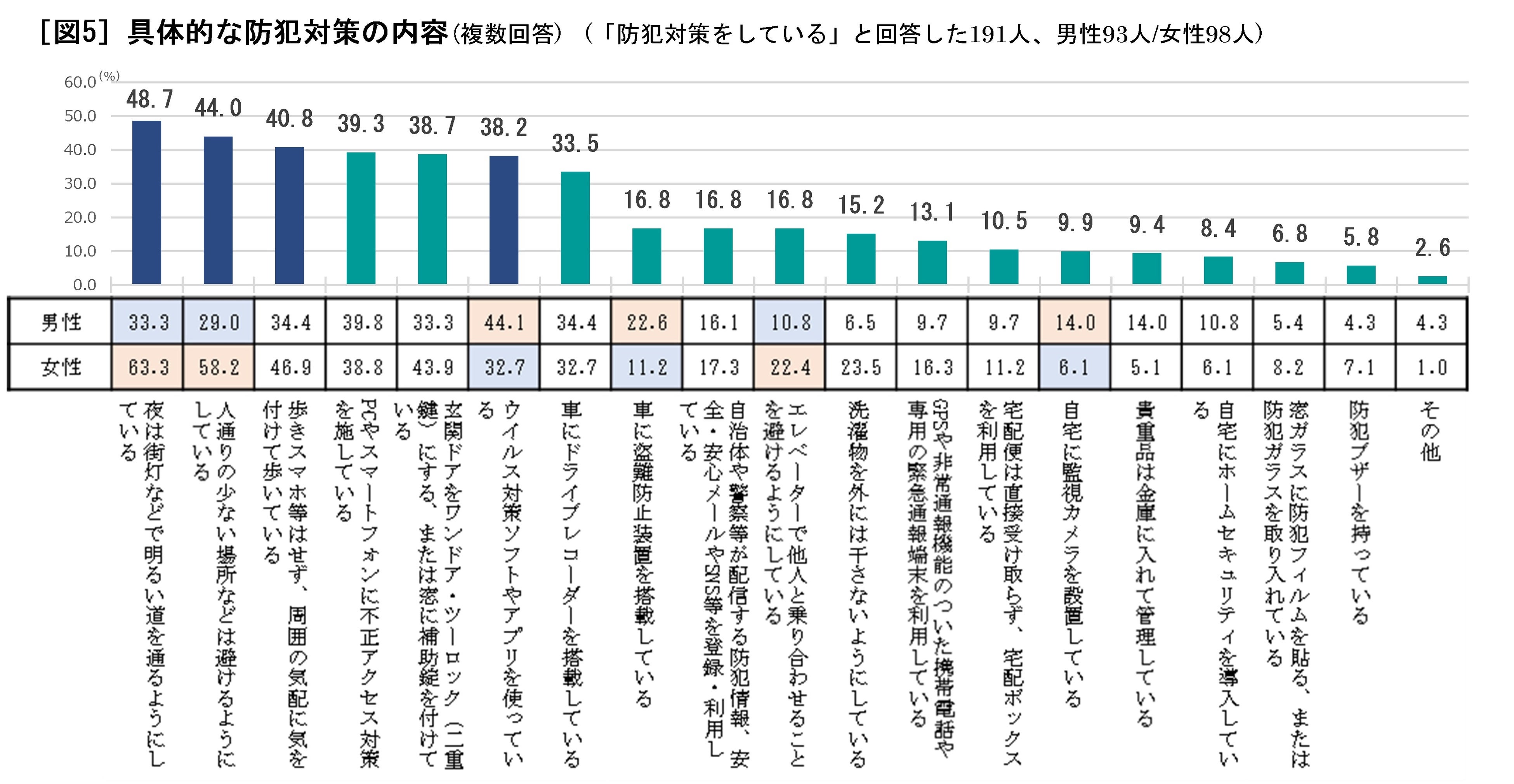 具体的な防犯対策の上位は「夜は街灯などで明るい道を通るようにしている」「人通りの少ない場所などは避けるようにしている」「歩きスマホ等はせず、周囲の気配に気を付けて歩いている」で、身近な場面で防犯を意識している人が多いようです。性別に見てみると、「夜は街灯などで明るい道を選ぶようにしている」や「人通りの少ない場所などは避けるようにしている」などは男性よりも女性で高い一方、「ウイルス対策ソフトやアプリを使っている」の割合は女性よりも男性で高くなっています【図5】。