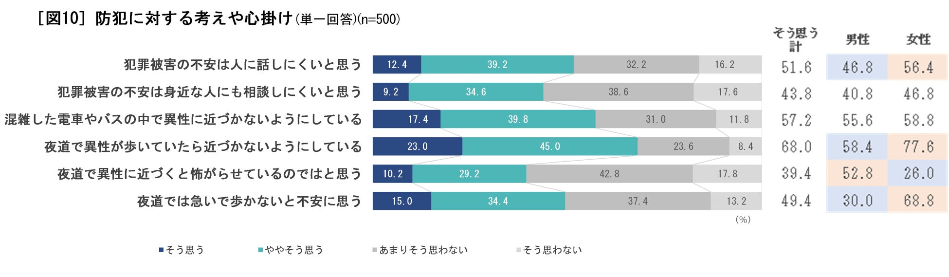 さらに防犯に対するさまざまな心掛けについて聞くと、「夜道では急いで歩かないと不安に思う」割合は全体では49.4%ですが、女性では68.8%と約20ポイント高くなっています。一方で、「夜道で異性に近づくと怖がらせているのではと思う」割合は全体では39.4%ですが、男性では52.8%と10ポイント以上高くなっています。その結果か、男性の約5割超が「混雑した電車やバスの中で異性に近づかないようにしている」(55.6%)、「夜道で異性が歩いていたら近づかないようにしている」(58.4%)と回答しており、他人を怖がらせるのではないかという不安が、行動にも表れていることがうかがえます【図10】。