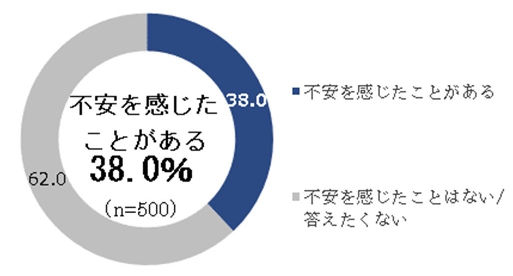 不安を感じたことがある割合は女性で特に高くなっているものの、下記のいずれかのシチュエーションを経験し不安を感じたことがある割合は全体76.8%、女性82.4%、男性71.2%となっており(全体から「特に不安を感じるシチュエーションはない」回答者を除いた割合)、男性も7割以上が何らかの不安を感じたことがあると分かります【図11】。