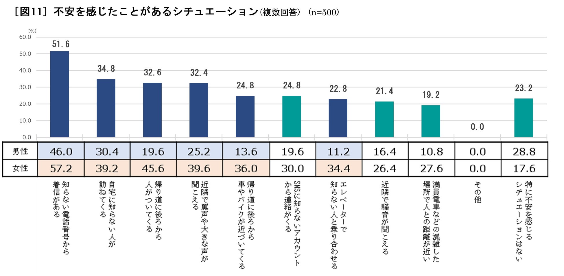 これまで不安を感じたことがあるシチュエーションについて、「知らない電話番号から着信がある」(51.6%)が最も多く半数以上という結果でした。次いで「自宅に知らない人が訪ねてくる」(34.8%)、「帰り道に後ろから人がついてくる」(32.6%)、「近隣で罵声や大きな声が聞こえる」(32.4%)といったシチュエーションも3人に1人が不安に感じる経験をしており、いずれも不安を感じた割合は女性が高くなっています。