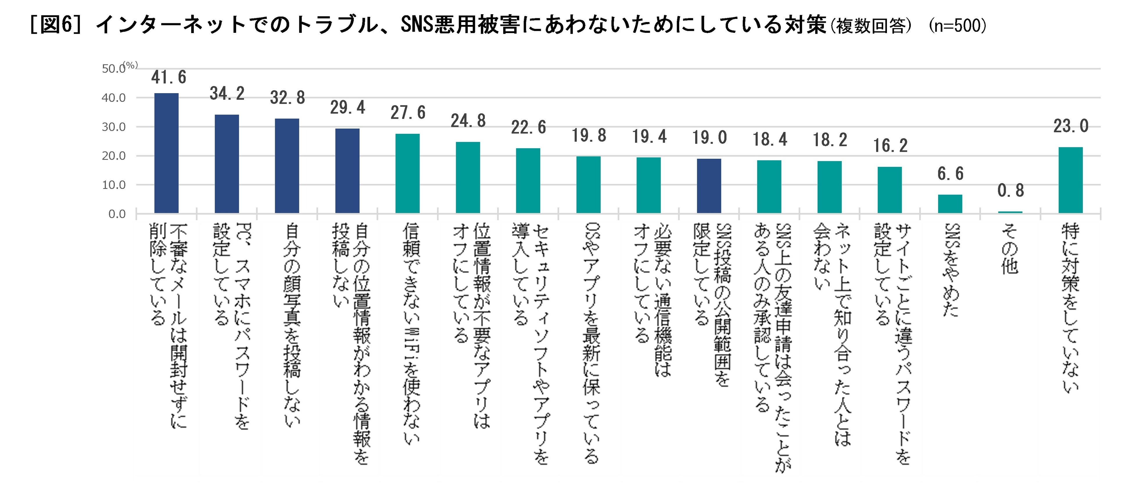 インターネットやSNS悪用などの犯罪への対策を聞くと、「不審なメールは開封せずに削除している」(41.6%)が最多でした。次いで「PC、スマホにパスワードを設定している」割合はわずか34.2%で、「自分の顔写真を投稿しない」(32.8%)、「自分の位置情報がわかる情報を投稿しない」(29.4%)、「SNS投稿の公開範囲を限定している」(19.0%)といった、SNSでのプライバシー保護の対策率も2割~3割にとどまっています【図6】。