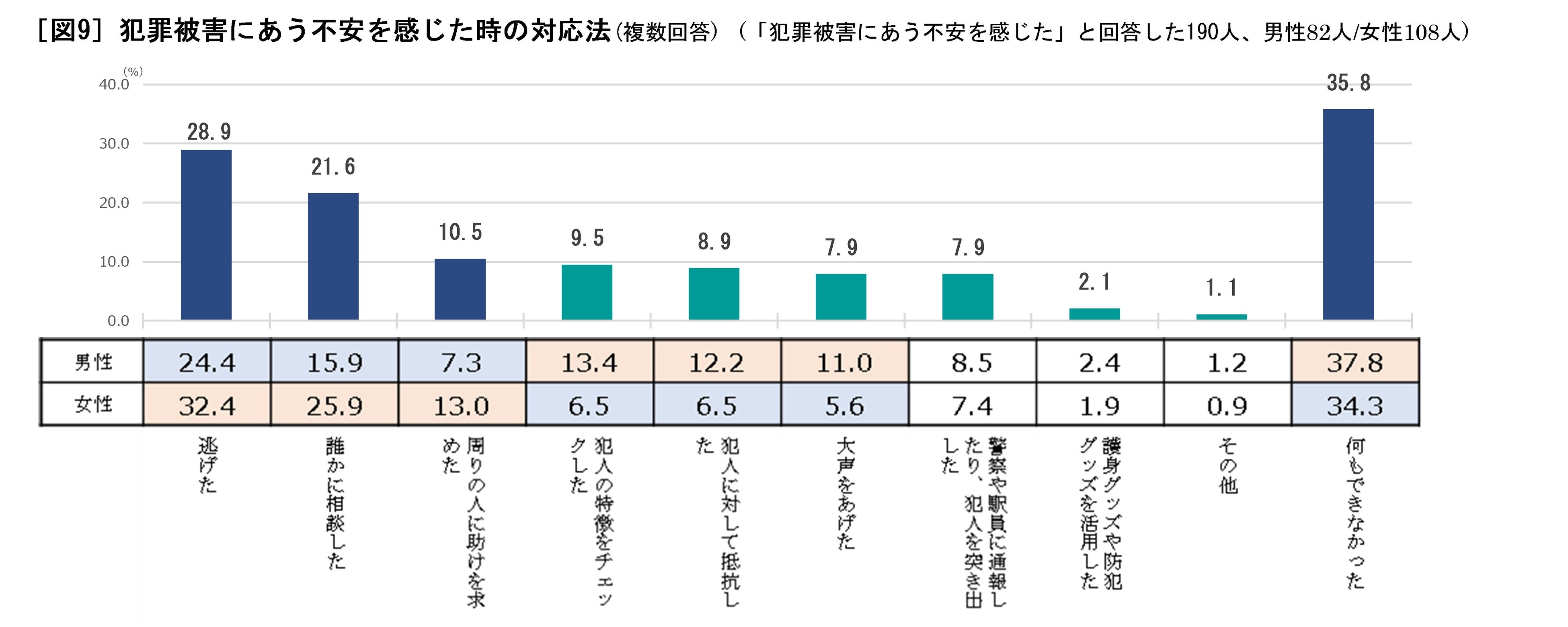 犯罪被害の不安を感じた時にとった対応を聞くと、「逃げた」(28.9%)や「誰かに相談した」(21.6%)などが上位に挙げられましたが、最も多かったのは「何もできなかった」(35.8%)という結果でした。その割合は男性の方が多く、ほかにも「誰かに相談した」や「周りの人に助けを求めた」の割合が女性に比べ低いことからも、犯罪への不安を誰かに相談しづらい様子が推察できます。一方で女性は犯人に対して抵抗した」「大声をあげた」割合が男性と比べて低いことから、相手に抵抗することの難しさも不安の要因になっていると考えられます【図9】。