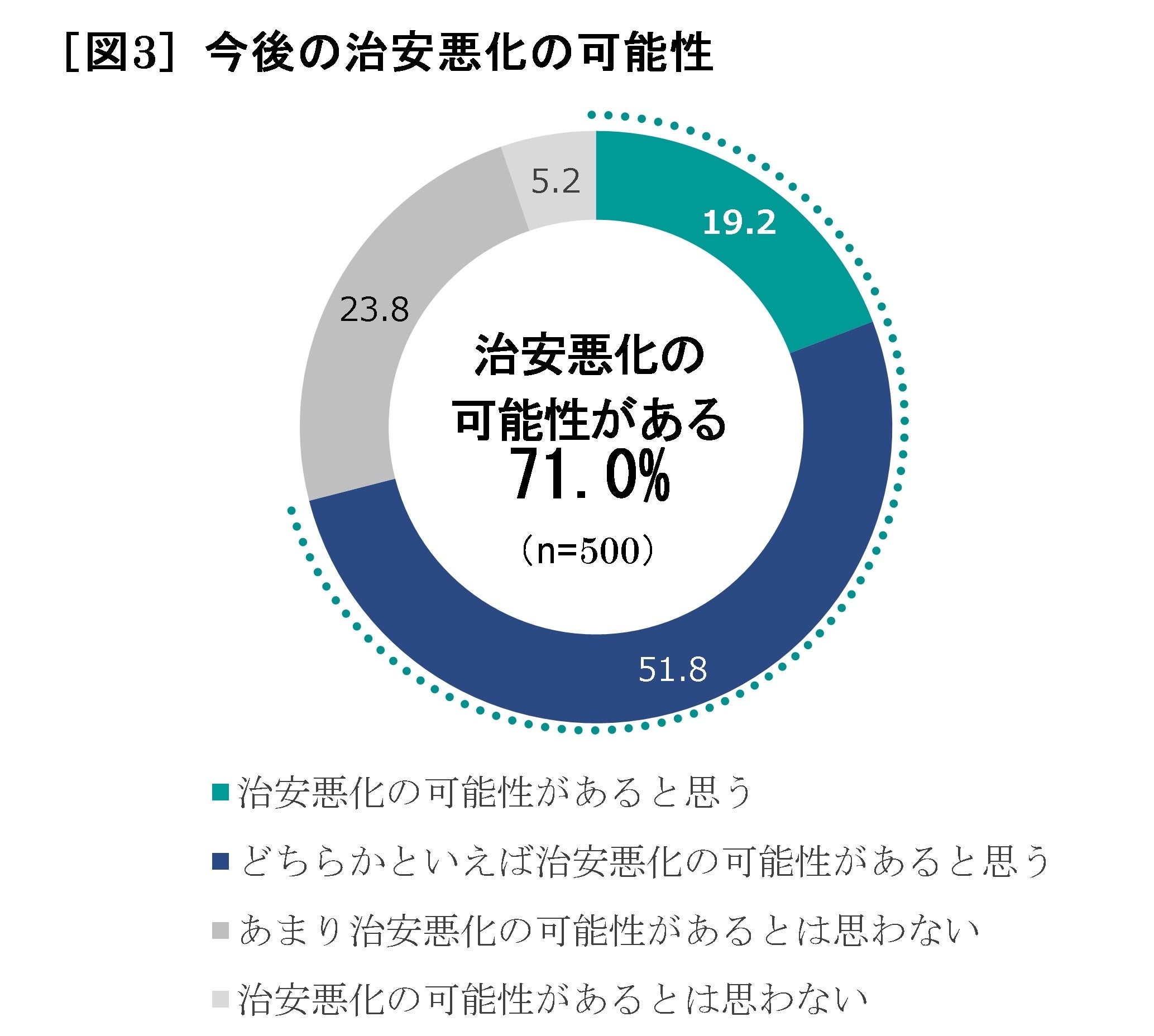 今後治安が悪化する可能性があると思うかと聞くと、71.0%の人が「治安悪化の可能性があると思う」(「治安悪化の可能性があると思う」「どちらかといえば治安悪化の可能性があると思う」の合計)と回答しました【図3】。