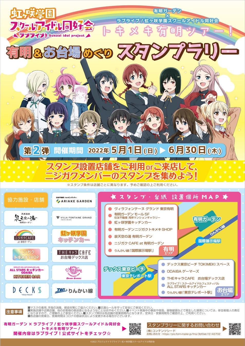 | スタンプラリー第2弾開催期間:2022年5⽉1⽇(⽇)〜6⽉30⽇(⽊) 【スタンプが設置されている施設・ショップ】 ・ホテル ヴィラフォンテーヌ グランド 東京有明 ・泉天空の湯 有明ガーデン ・住友不動産 湾岸マンションギャラリー(有明ガーデン モール5F) ・ニジガクトキメキSHOP(有明ガーデン モール2F) ・虹ヶ咲学園キッチンカー(有明ガーデン 1Fシーズンプロムナード) ・ニジガクCAFE at 有明ガーデン(有明ガーデン 1F有明ガーデンギャラリー) ・りんかい線「国際展⽰場駅」 ・デックス東京ビーチ TOKIMEKI スペース ・ODAIBA ゲーマーズ ・THEキャラCAFE お台場デックス店 ・ラブライブ!スクールアイドルフェスティバル ALL STARS キッチンカー ・りんかい線「東京テレポート駅」 ※台紙はスタンプが設置されている施設・ショップにあります。 ※スタンプがもらえる条件は店舗ごとに異なります。 ▼スタンプラリーに関するお問い合わせ 株式会社 コンテンツシード https://pro.form-mailer.jp/fms/3bf0ab15143702 |