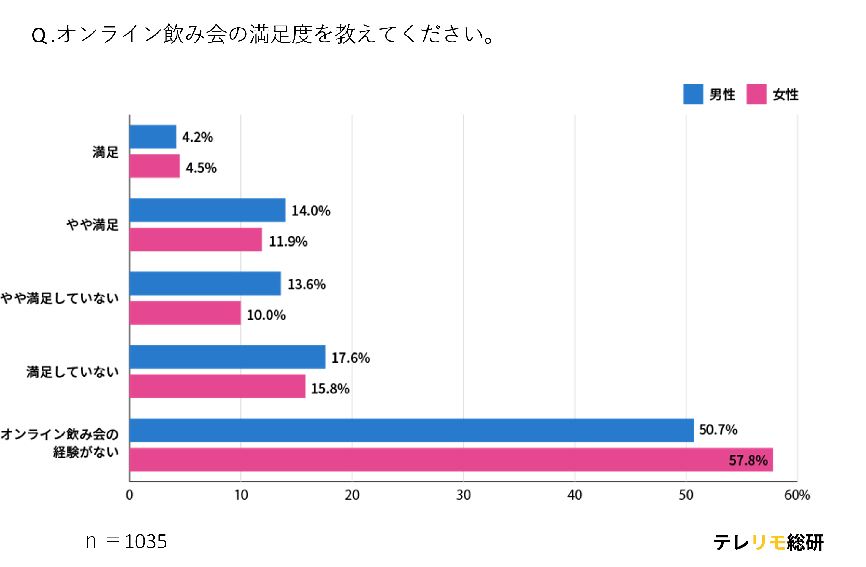 アンケート結果から、オンライン飲み会の経験がある方は約半数、2人に1人の割合であることが分かりました。また、その満足度については、「満足していない」が最も多く、「やや満足していない」とあわせると男性の約3割、女性の25%にのぼりました。