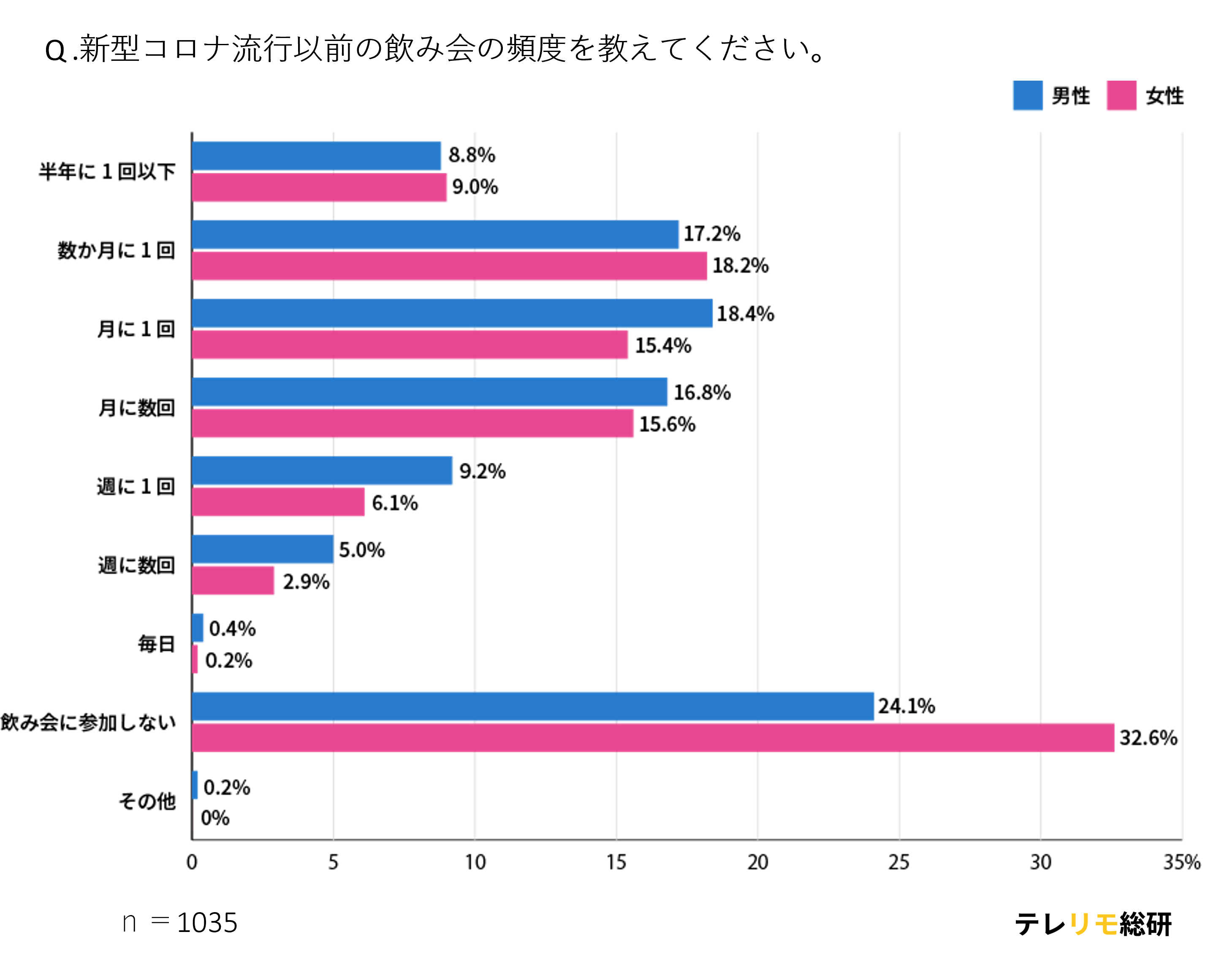 新型コロナ流行前後の飲み会の頻度について、結果はそれぞれ以下の通りとなりました。