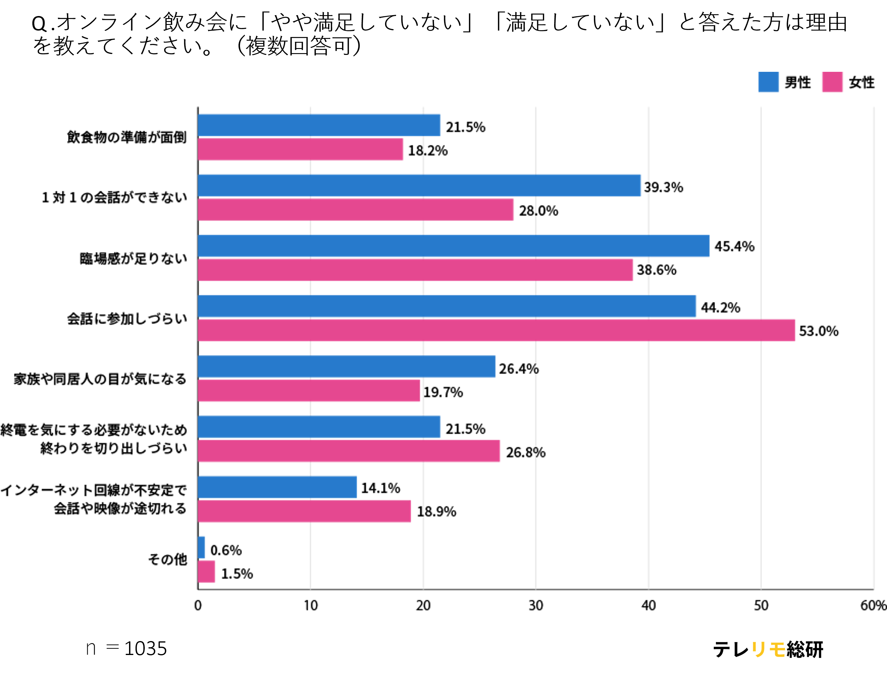 オンライン飲み会に満足していない理由についてのアンケート結果は以下の通りです。