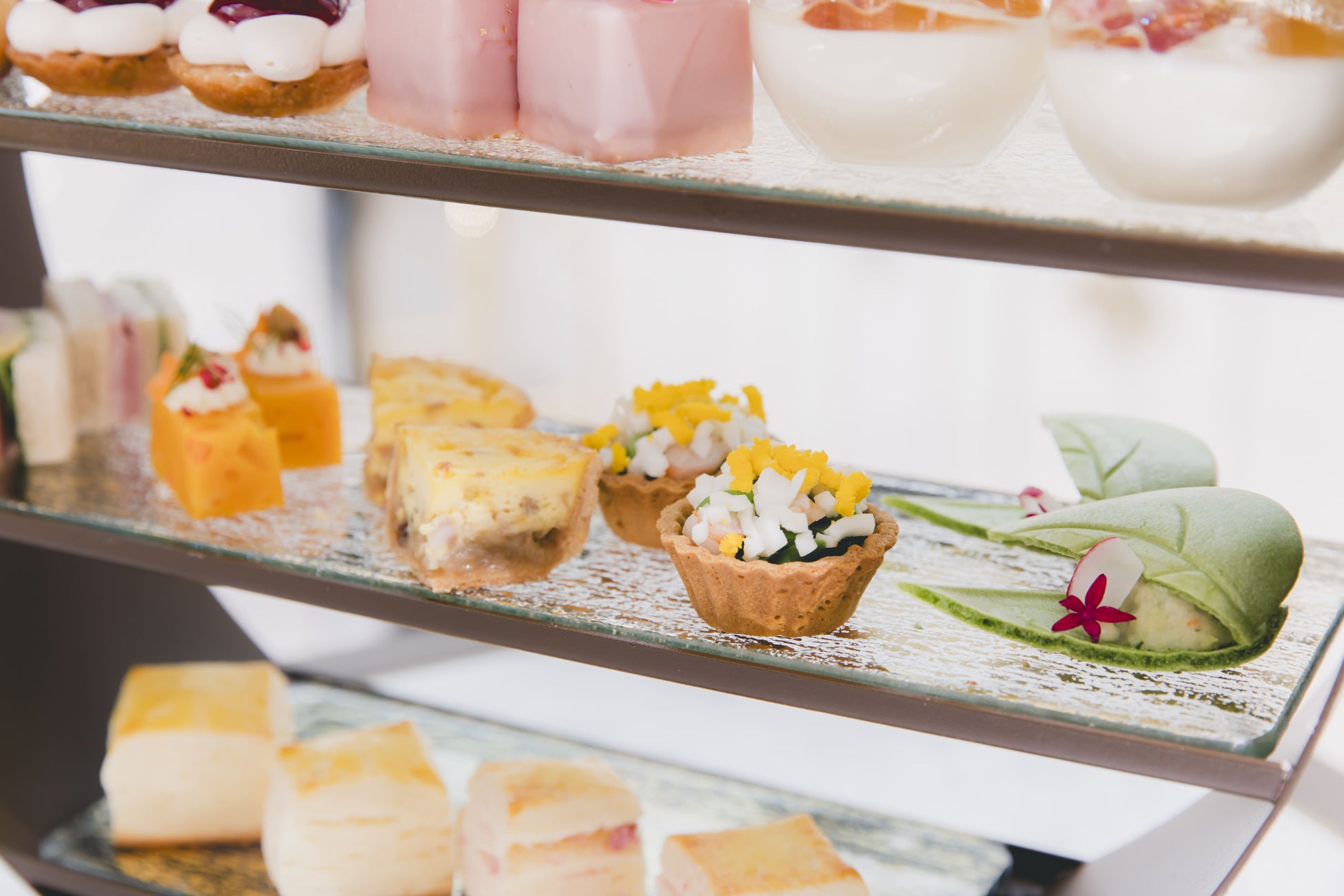 <セイボリー>ホワイトアスパラガスとハムのサンドイッチ/ベーコンと新たまねぎのキッシュ/人参のケークサレ/エビと豆のタルトレット ミモザ風/ホタテ貝とブランダードを挟んだ最中