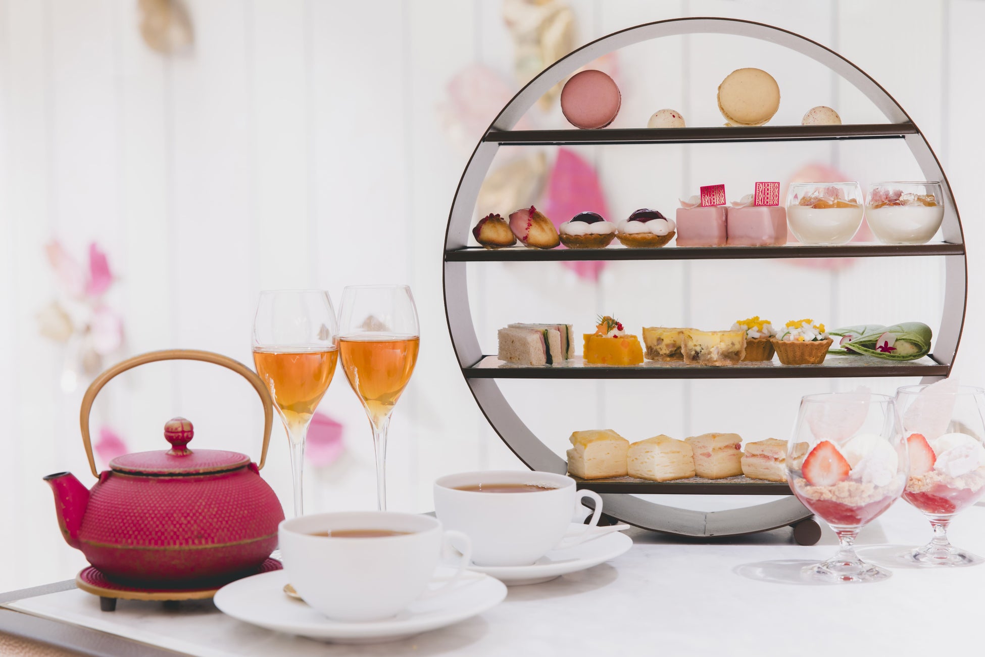 桜がホテルモチーフのフォションホテル京都で、見た目に可愛らしいだけではなく、素材の味も生きる、春ならではの桜舞い散る華やかなアフタヌーンティーをお楽しみください。