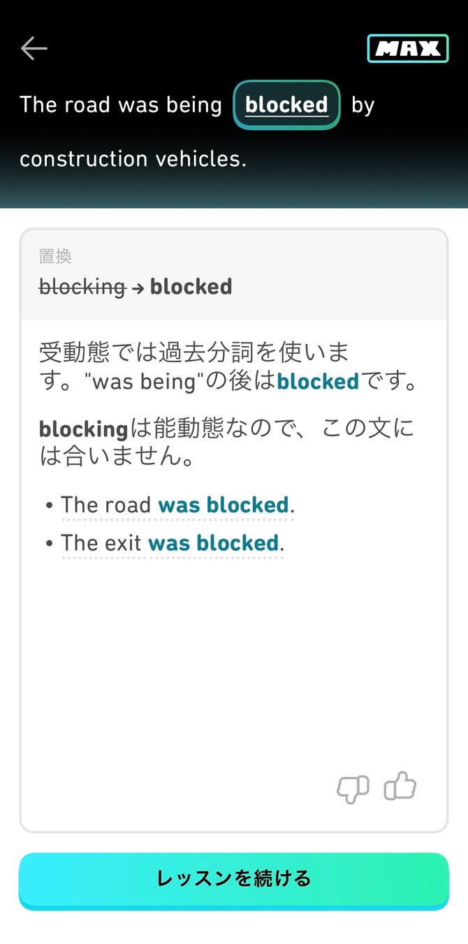 スマート解説:レッスンの大部分の問題形式において、文脈に応じた解説を自動で生成し、ユーザーに対してなぜ自分の回答が間違いであったかを解説します。