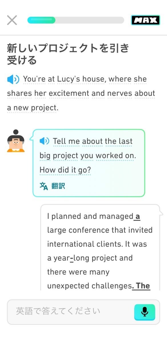 これまでもDuolingoはAIを活用し、一人ひとりに合った学習を提供してまいりました。新機能では、話者のスピーキングスキルに応じて難易度が自動的に調整されるため、初心者から上級者まで幅広いレベルの学習者が英会話を楽しむことができます。