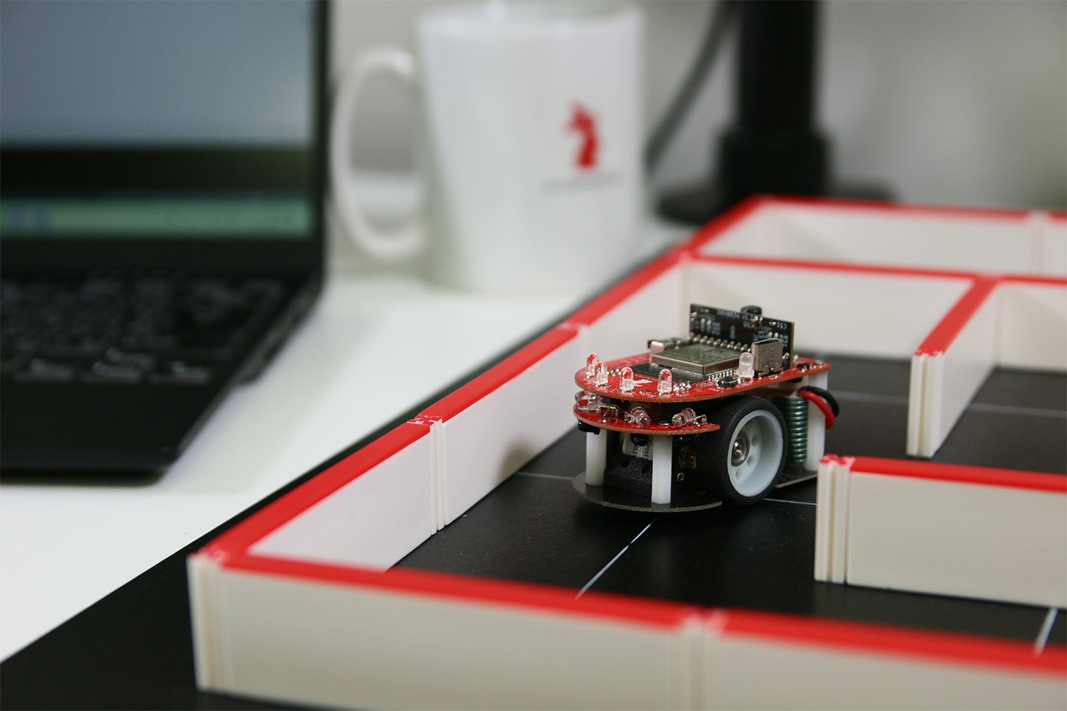 ロボットが迷路の最短走行を競う、公益財団法人ニューテクノロジー振興財団が開催する各種マイクロマウス大会のマイクロマウス競技の規格に準拠しています。初めてロボットを触わる方でも、競技会への挑戦が可能です。