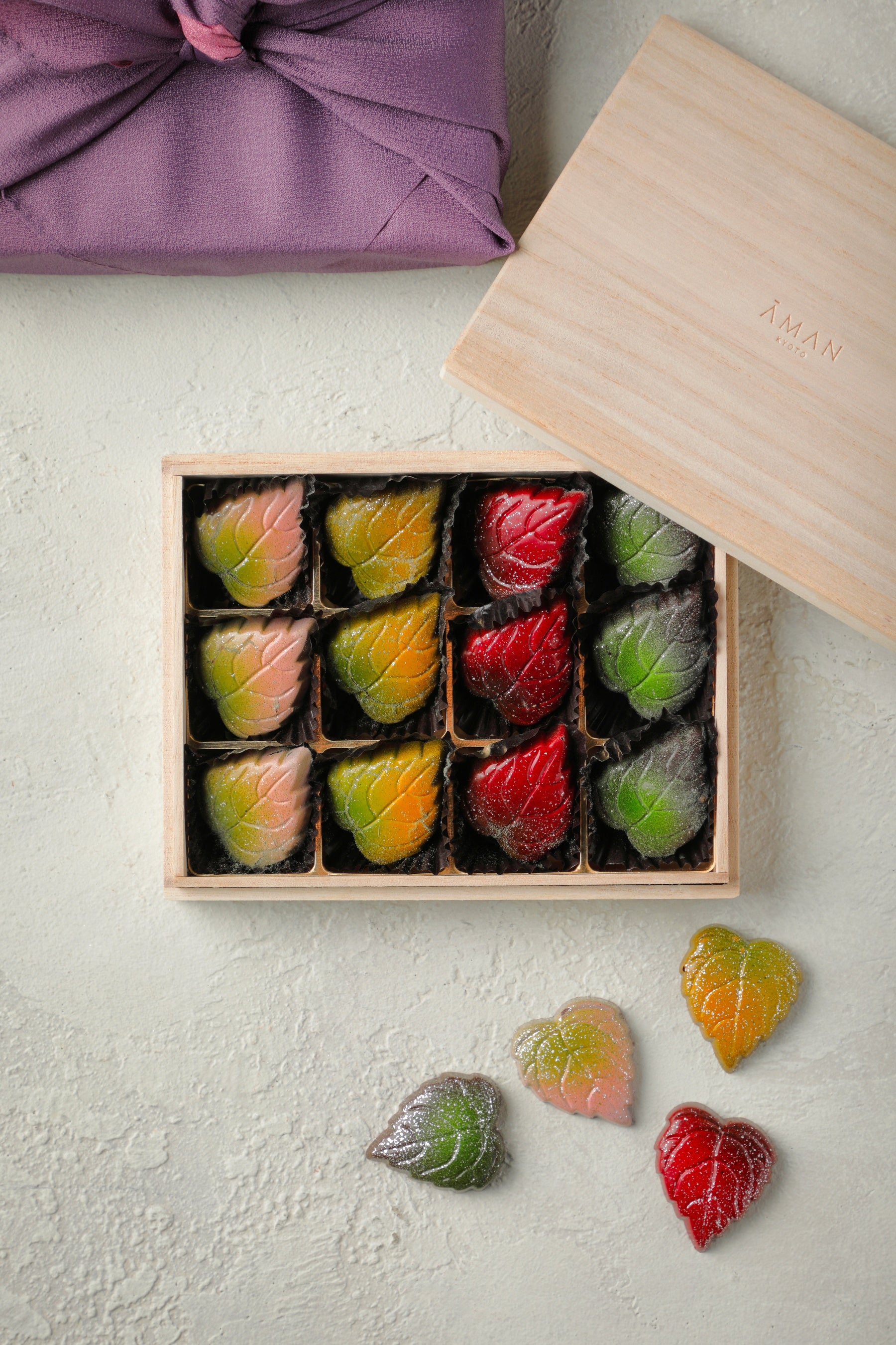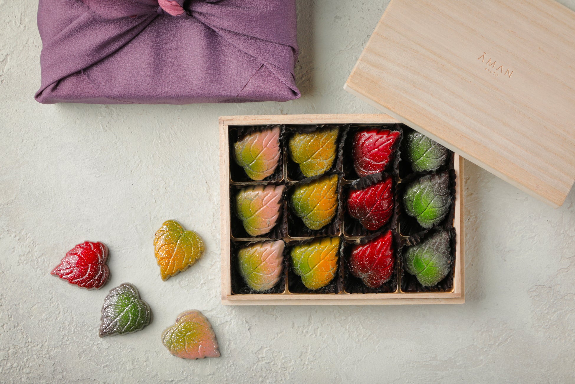 淡いピンクや若葉のようにフレッシュな黄緑など、色とりどりの葉に思わず目を奪われるエグゼクティブペストリーシェフ松尾浩幸のオリジナルチョコレート。今年のホワイトデーには新たに「桜と宇治煎茶」を加え、ひとつひとつ丁寧に4種のフレーバーをご用意いたします。木箱に並び風呂敷でお包みしたギフトは大切な方へ、あるいはご自身へのご褒美にもおすすめです。