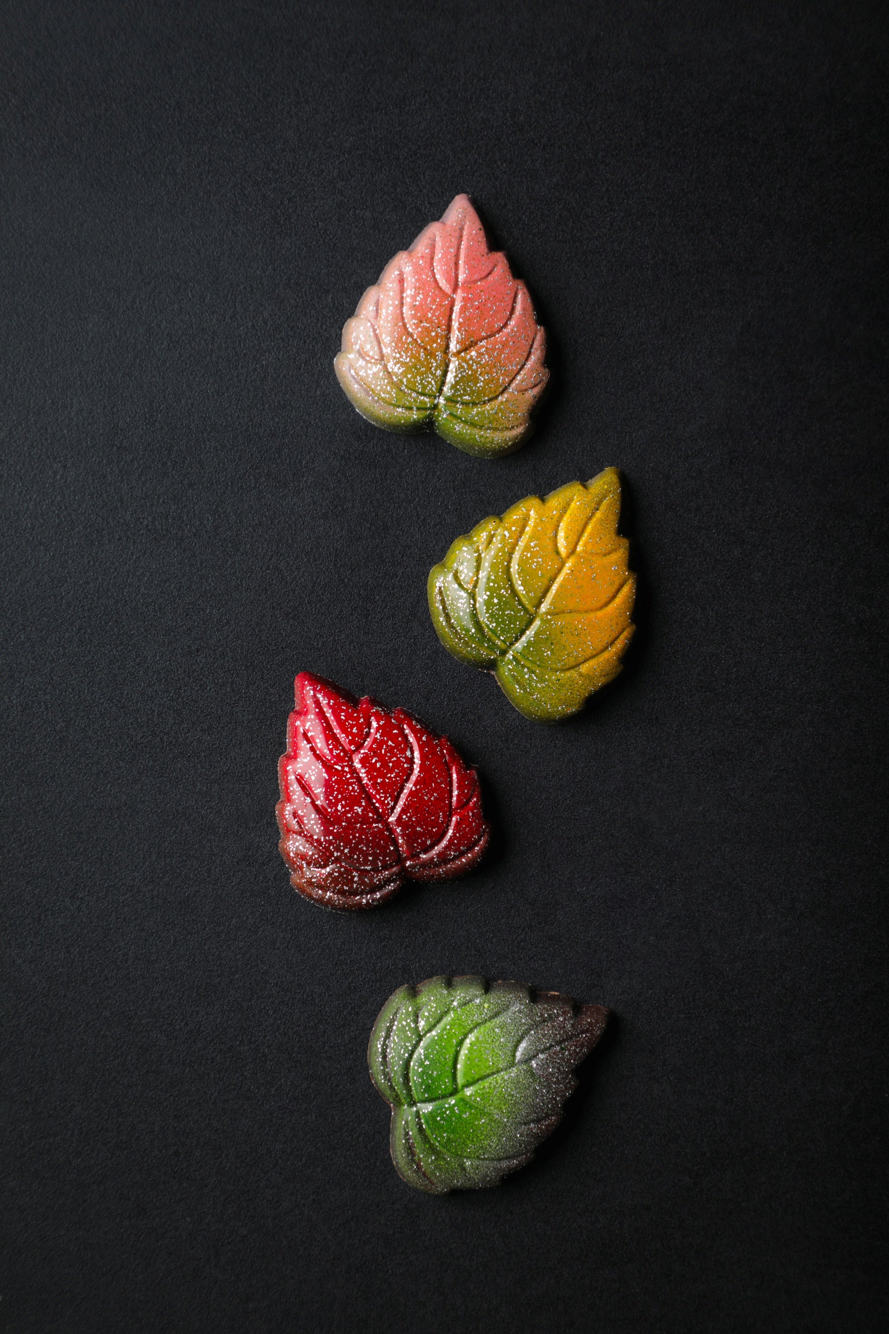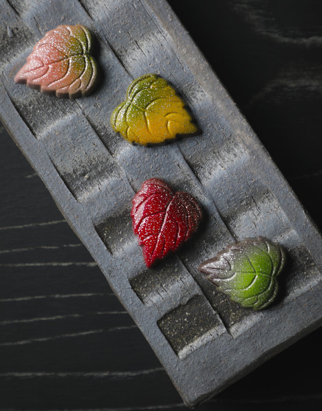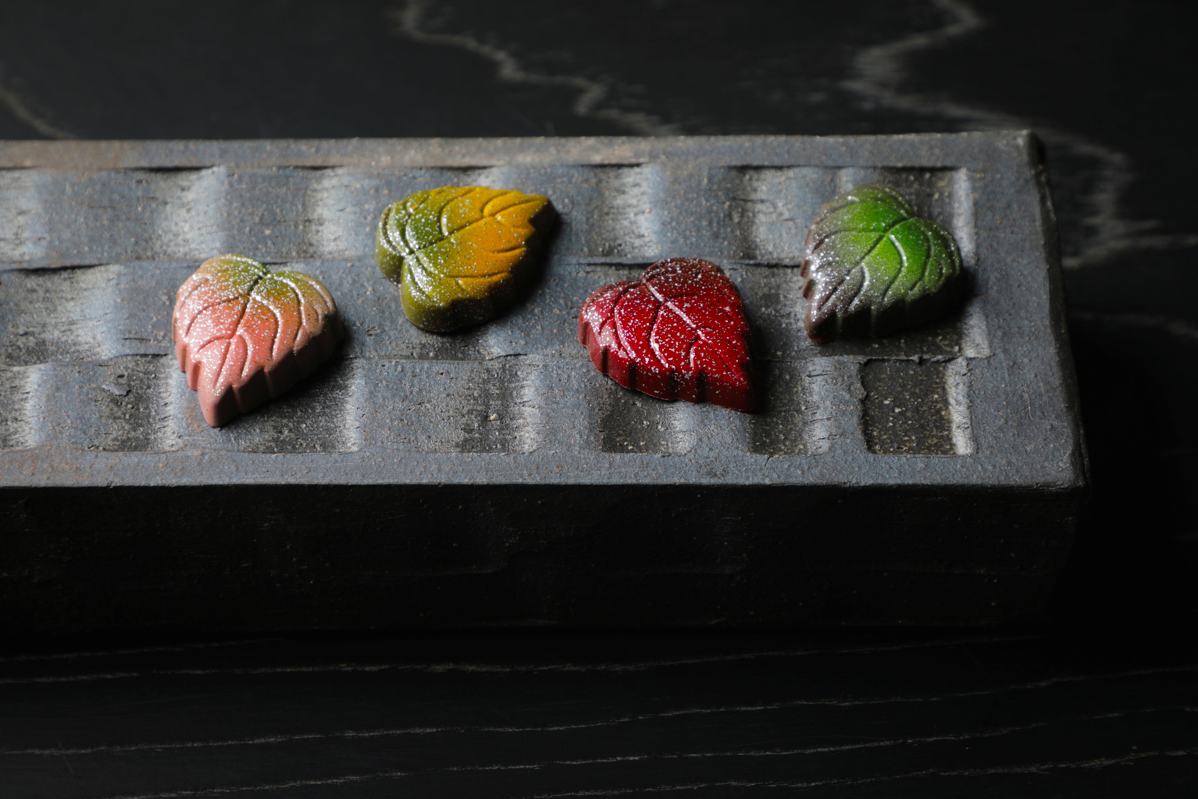 ■上賀茂いちご 秋の紅葉のように赤く愛らしい葉には、同じく京都・上賀茂のいちごをたっぷりと贅沢に用い、クリーミーなガナッシュをくちどけのよいフランス産ダークチョコレートの中に閉じ込めました。いちごの甘酸っぱい酸味がカカオを引き立てる、華やかなテイスト。