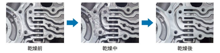 ワークに付着した水分を、真空を利用して蒸発させる小型乾燥機です。気圧が下がると、水は100℃よりも低い温度で沸騰します。この原理を利用し、EVADRYは機内の気圧を真空まで下げることで、部品の深部やタップ穴に残る水分まで徹底的に蒸発させて乾燥します。一般的な乾燥方法であるエアブローと比較して、消費電力が非常に少ないことが特長で、昨今叫ばれている消費電力・CO2排出量削減の動きにも貢献します。