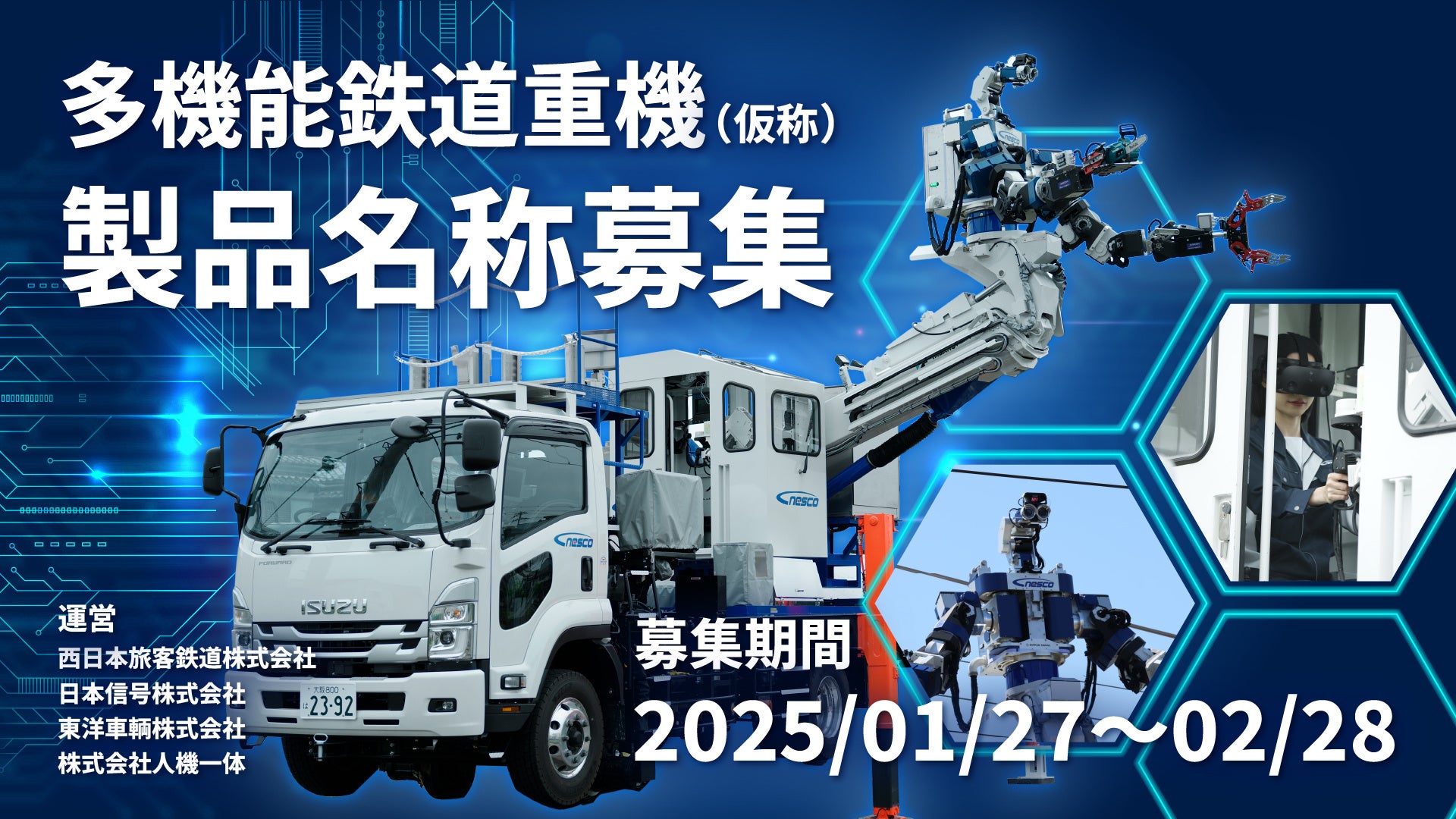 西日本旅客鉄道株式会社(以下、JR 西日本)、日本信号株式会社(以下、日本信号)、株式会社東洋車輛(以下、東洋車輛)、株式会社人機一体(以下、人機一体)は、鉄道工事用車両に人型ロボットを搭載し、高所で人が実施している多様な設備メンテナンスに対応する「多機能鉄道重機(仮称)」を開発いたしました。本製品は、初の人型鉄道整備ロボットであり、2024 年 07 月より JR 西日本における鉄道メンテナンスでの正式運用が開始されています。この「多機能鉄道重機(仮称)」について、より広範な作業への展開と普及を目指し、わかりやすく呼称しやすい製品名称を募集いたします。皆様からのたくさんの御応募を心よりお待ちしております。