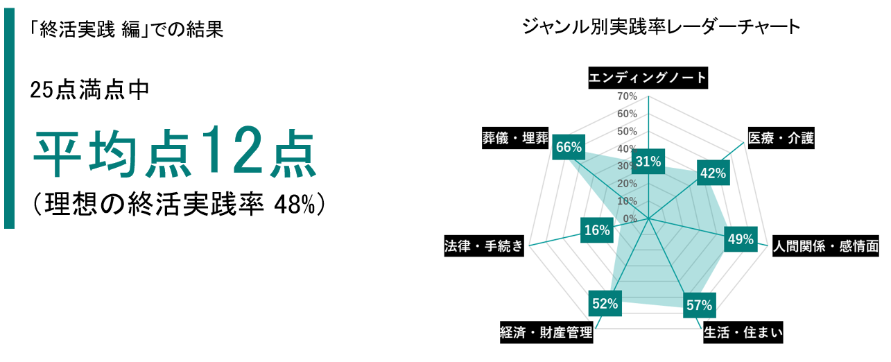 この調査は、ニチリョクが考える理想の終活に関する実践状況を調査するためのもので、合計25項目からなる質問表を制作しました。質問内容は、財産管理や医療・介護の希望、葬儀・お墓の手配、家族とのコミュニケーションなど多岐にわたります。 その結果25問に対して、平均点は12点(理想の終活実践率は48%)という結果になりました。全体として、葬儀や生活に関する準備は進んでいるものの、法律や書面に関する準備が遅れていることが終活の課題として浮き彫りになっています。