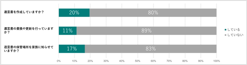 「遺言書を作成しているか?」という質問に対しては、20%が「している」と回答。また、「遺言書の修正や更新を行っているか?」という質問に関しては、わずか11%が「している」と答え、さらに、「遺言書の保管場所を家族に知らせているか?」という問いに対しては、17%が実施しているという結果に。この結果から終活の中でも特にこの分野での取り組みが遅れていることが明らかとなり、より深い部分の終活については、まだまだ取り組みが不足していることが課題であることがわかります。