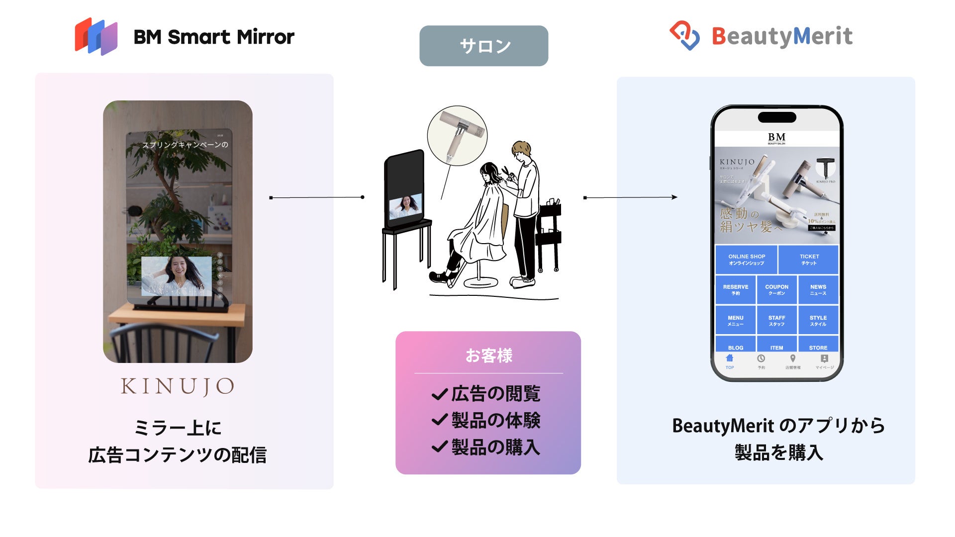本取り組みにより、KINUJO社の美容家電ブランド広告や製品紹介コンテンツを理美容店舗に設置されたスマートミラー上で配信し、BeautyMeritのアプリ上からオンラインまたは店頭でKINUJO社の商品を購入することが可能になります。
