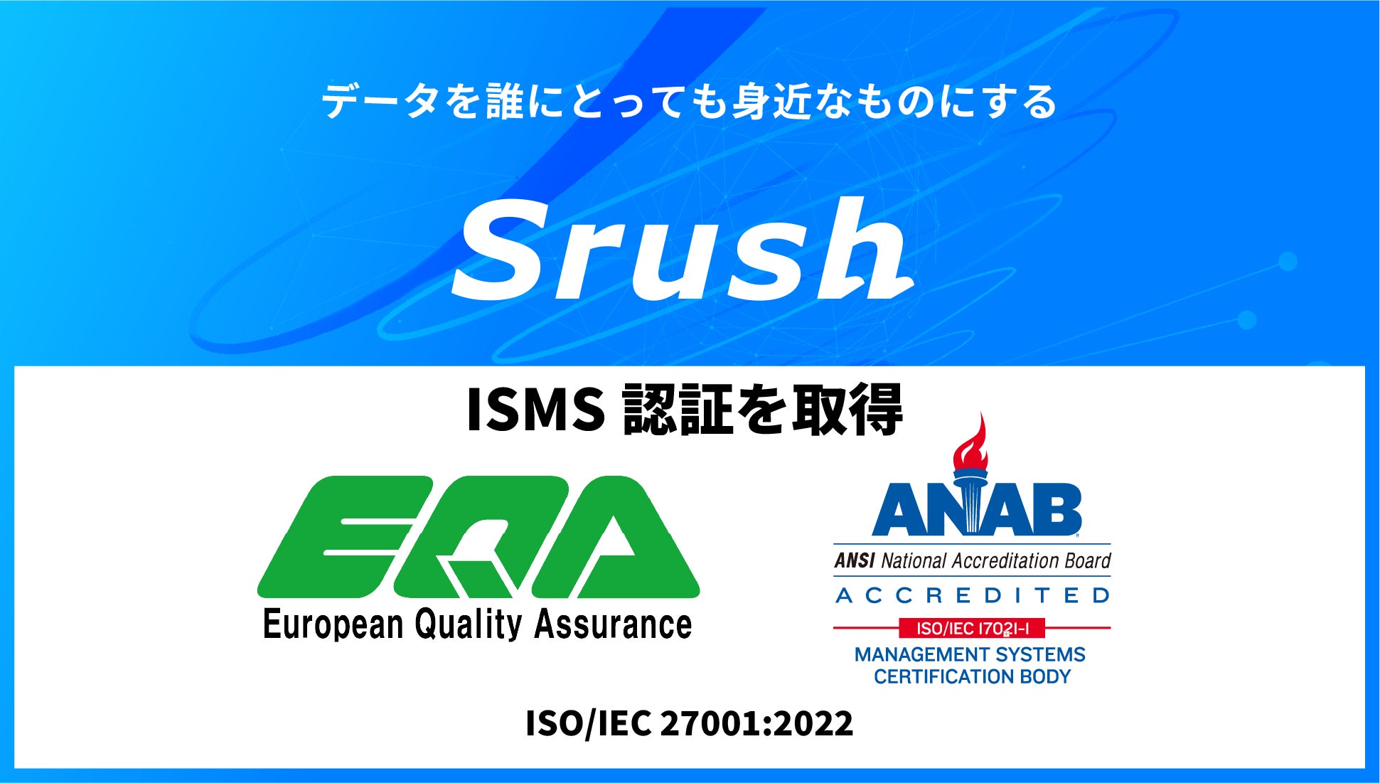 中堅・中小企業のデータ活用推進に取り組む株式会社Srush(東京都品川区、代表取締役:樋口 海、以下「当社」)は、情報セキュリティマネジメントシステム(ISMS)の国際規格である「ISO/IEC 27001:2022」および「JIS Q 27001:2023」の認証を取得いたしましたことをお知らせします。