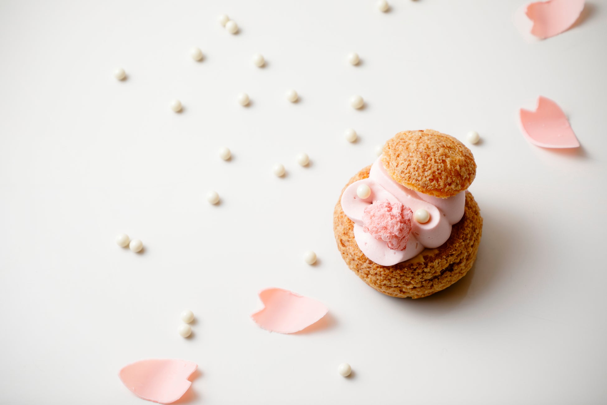 柔らかな春色が目を引くシュークリームは、サクサクとしたシュー生地に、桜のシャンティクリームをたっぷりとあしらい、穏やかな春を表現しました。なめらかなカスタードクリームと、上品な甘さのこしあん、さらに求肥を忍ばせ、和の繊細さを織りこみました。シェフの遊び心が息づくシュークリームで、日本の春の味わいが奏でる特別なティータイムをお過ごしください。
