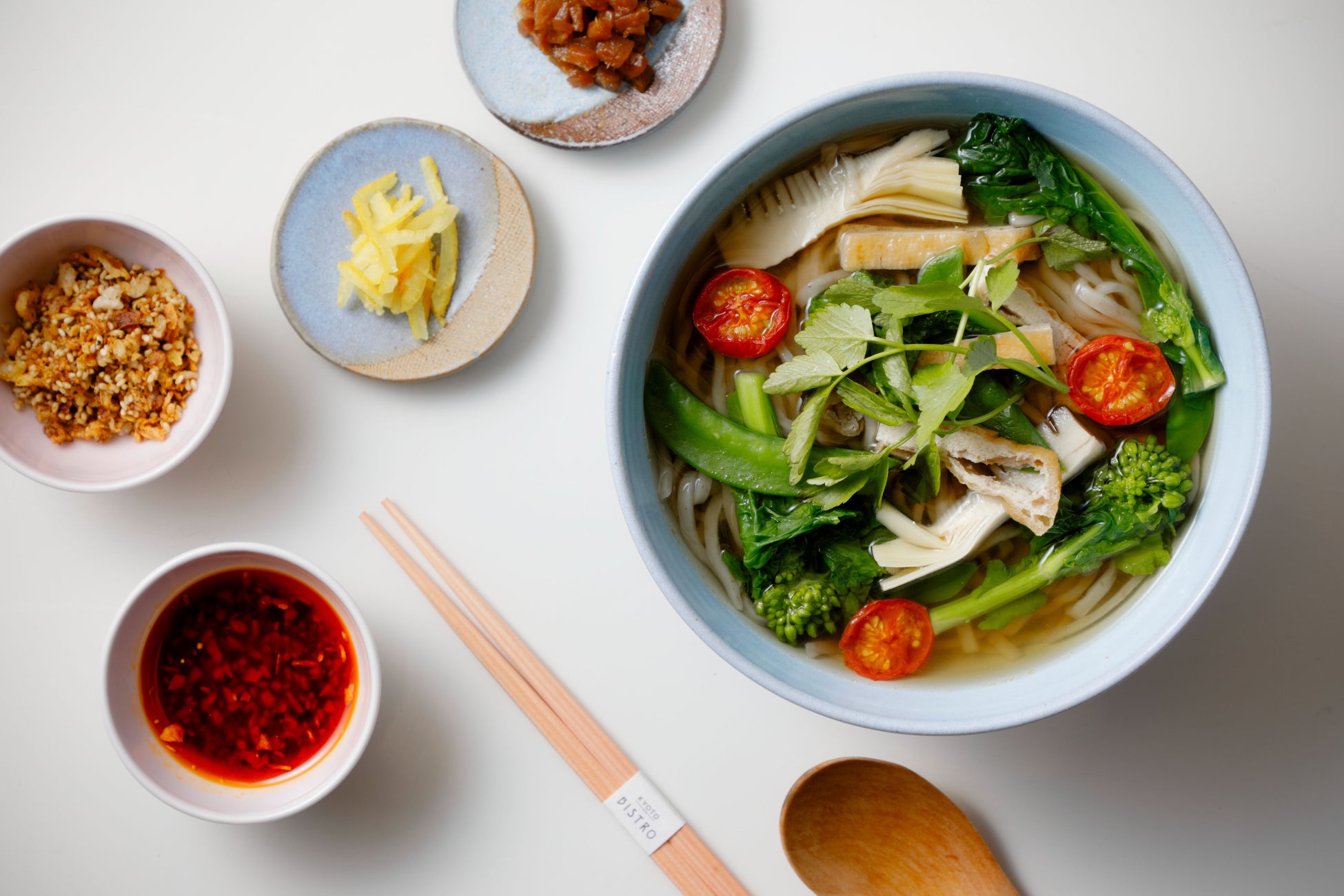 芹、筍、絹さやといった春の野菜と、京都の「南禅寺豆腐屋 服部」の油揚げを使ったおうどんは、旨味がじっくりと広がるかつおのお出汁に春野菜が馴染み、ほっとした味わいをお楽しみいただけます。付け合わせには、シェフこだわりの4種類のコンディメントを。中でもおすすめはフライドオニオン・白葱・生姜、黒七味をライスパフと合わせたザクザクの食感が楽しい「スパイスチップ」、さらに八角と醤油で生姜を煮込んだオリエンタルな味わいの「生姜の甘辛煮」、唐辛子、ガーリック、玉ねぎをごま油でじっくりと火入れをした旨味たっぷりの「食べるラー油」、爽やかさを添える「刻み柚子(皮)」と、さまざまな味わいの変化を楽しめるのもうれしいポイントです。