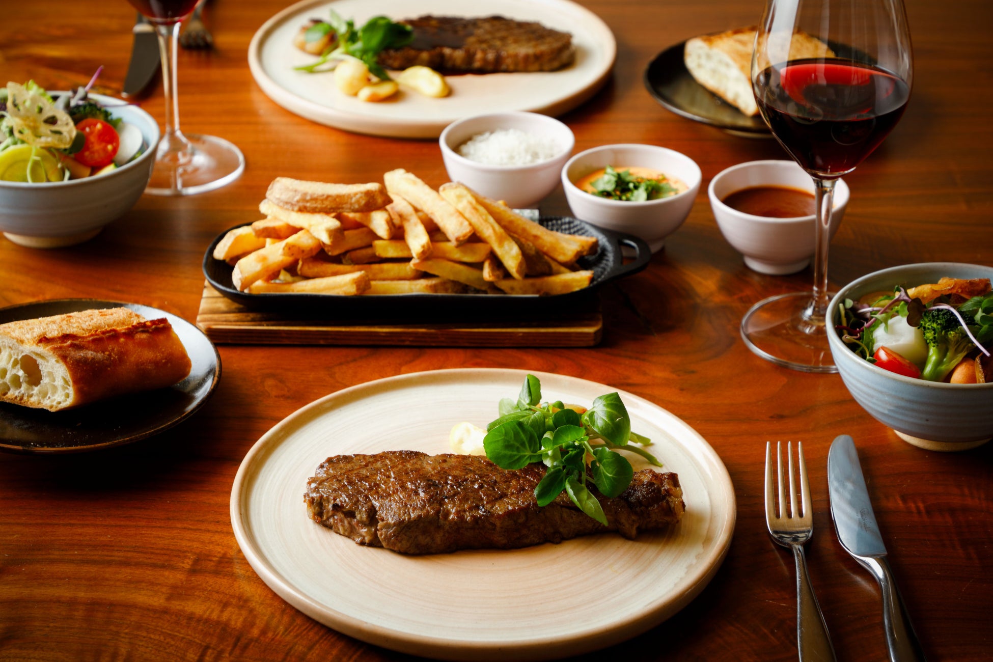 ジューシーな肉汁と、濃厚な旨味があふれ出す上質な味わいの和牛は、舌の上でほどける贅沢な味わいが特徴。『KYOTO BISTRO』オリジナルの生姜ドレッシングでさっぱりといただけるサラダに、何度でもおかわりできるユニークなフレンチフライのフリーフローは、毎日店内でカットしたポテトを揚げたてでご用意します。サクッとしたあとにほくほくとしたポテトのフレッシュな味わいを、異なる3種類のソースとともにお楽しみください。ボリューム満点のセットメニューは、みずみずしいいちごとルバーブのソルベでさっぱりと締めくくります。滑らかな口当たりのオレンジリキュール「グランマニエ」をかけることで、オレンジの華やかさとジューシーないちご、ルバーブの酸味が重なり絶妙な味わいを奏でる大人のデザートへと昇華します。