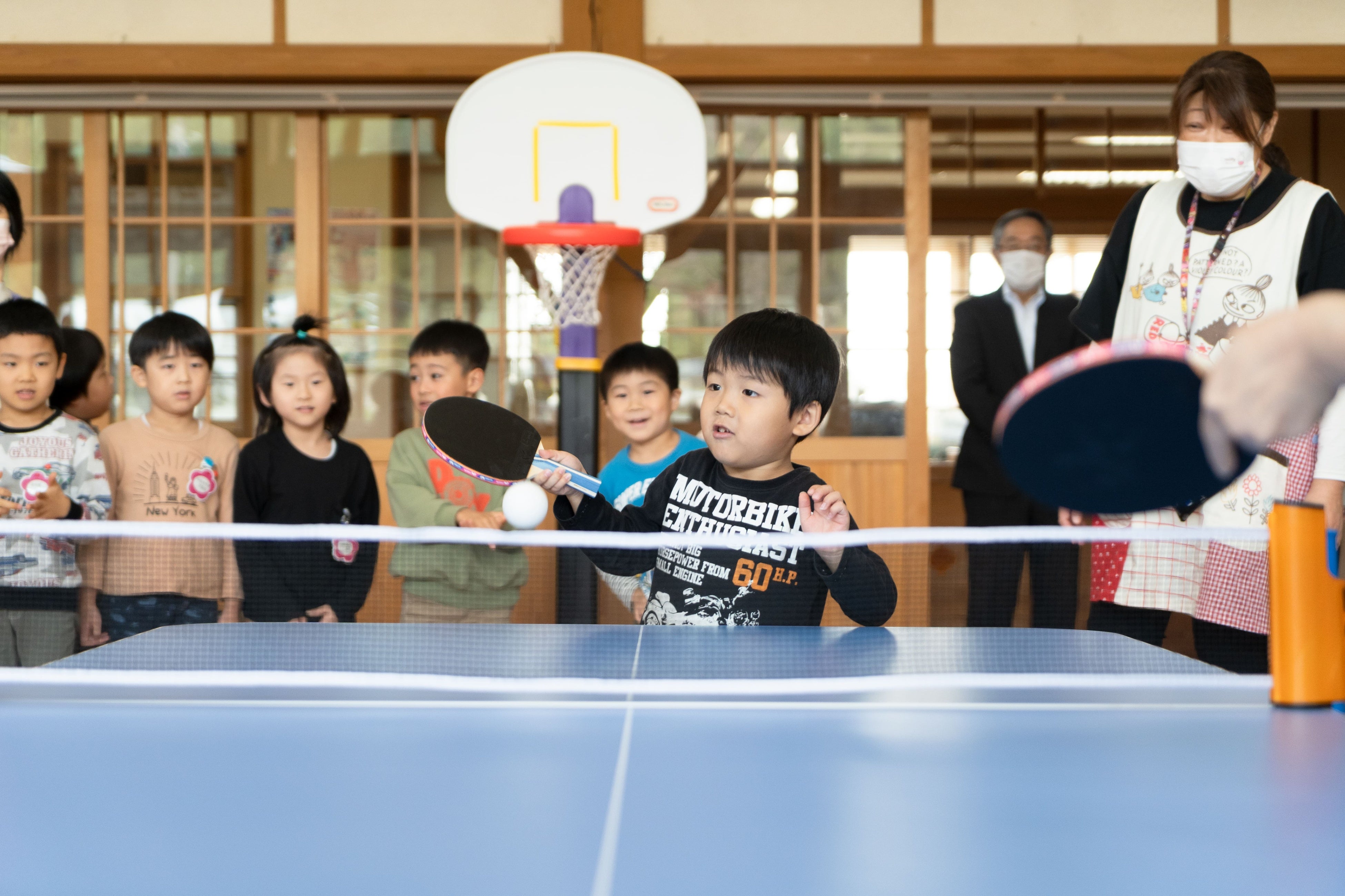 もりやまこども園本園は昨年度に創立50周年を迎え、大川分園は来年度に創立50周年を迎えます。この記念すべきときに、園も子ども達も笑顔になる機会を与えていただき感謝しています。保護者の方々からも、とても嬉しいという声が聞こえてきます。夏は大雨の被害で町が大変でしたが、子どもたちの笑顔が何よりの復旧の励ましになります。五城目町はもともと卓球が盛んな地域でした。現在も愛好者がたくさんおり、園として、たくさんの人と交流するために活用していきたいと思います。