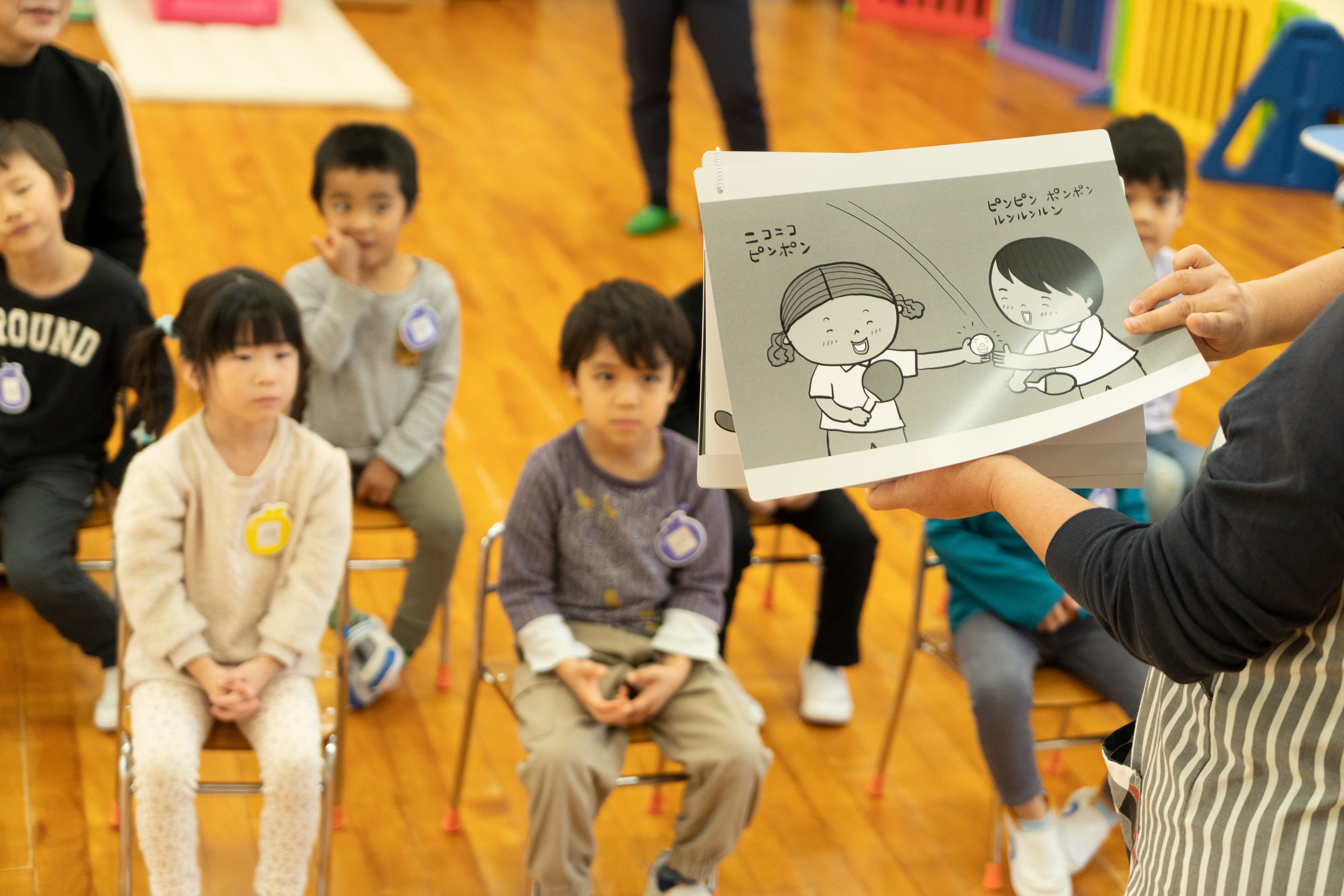 卓球を題材にした絵本と卓球体験に園児たちが歓声