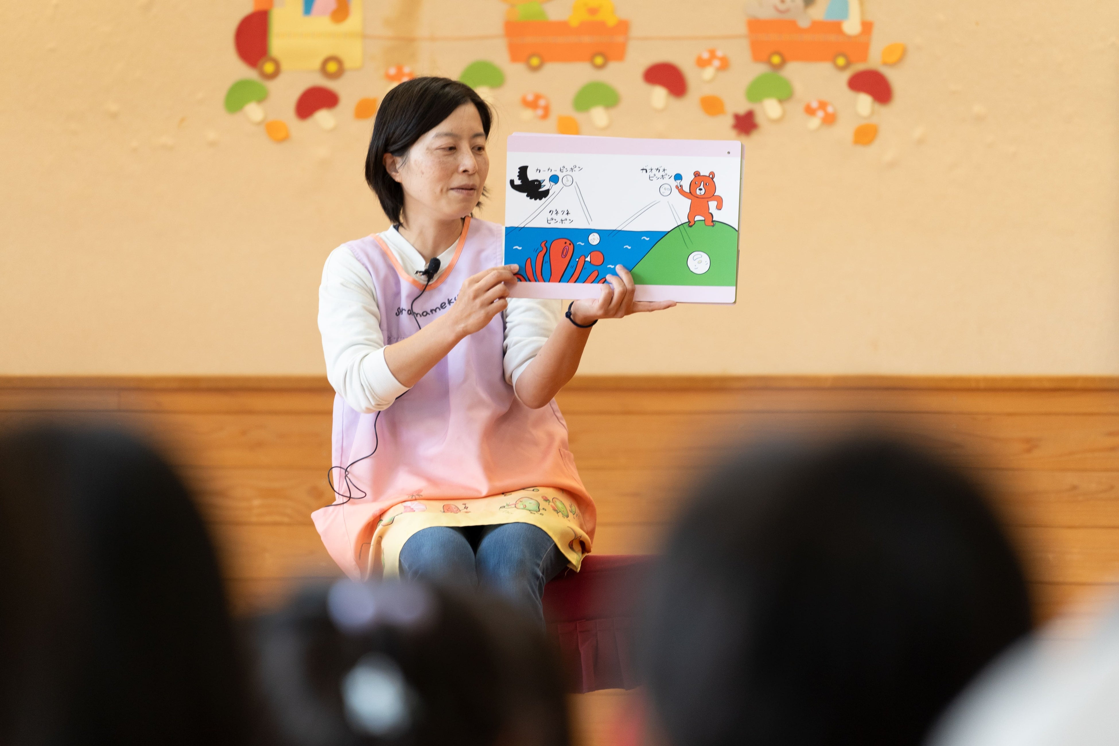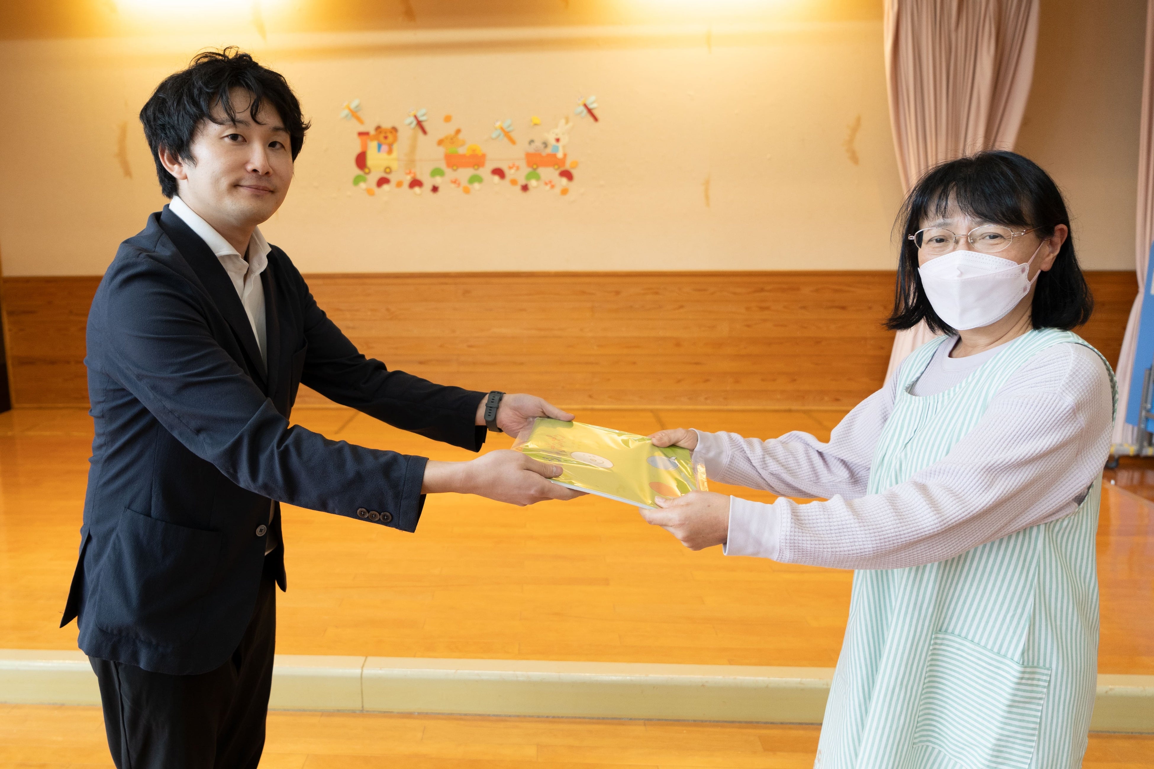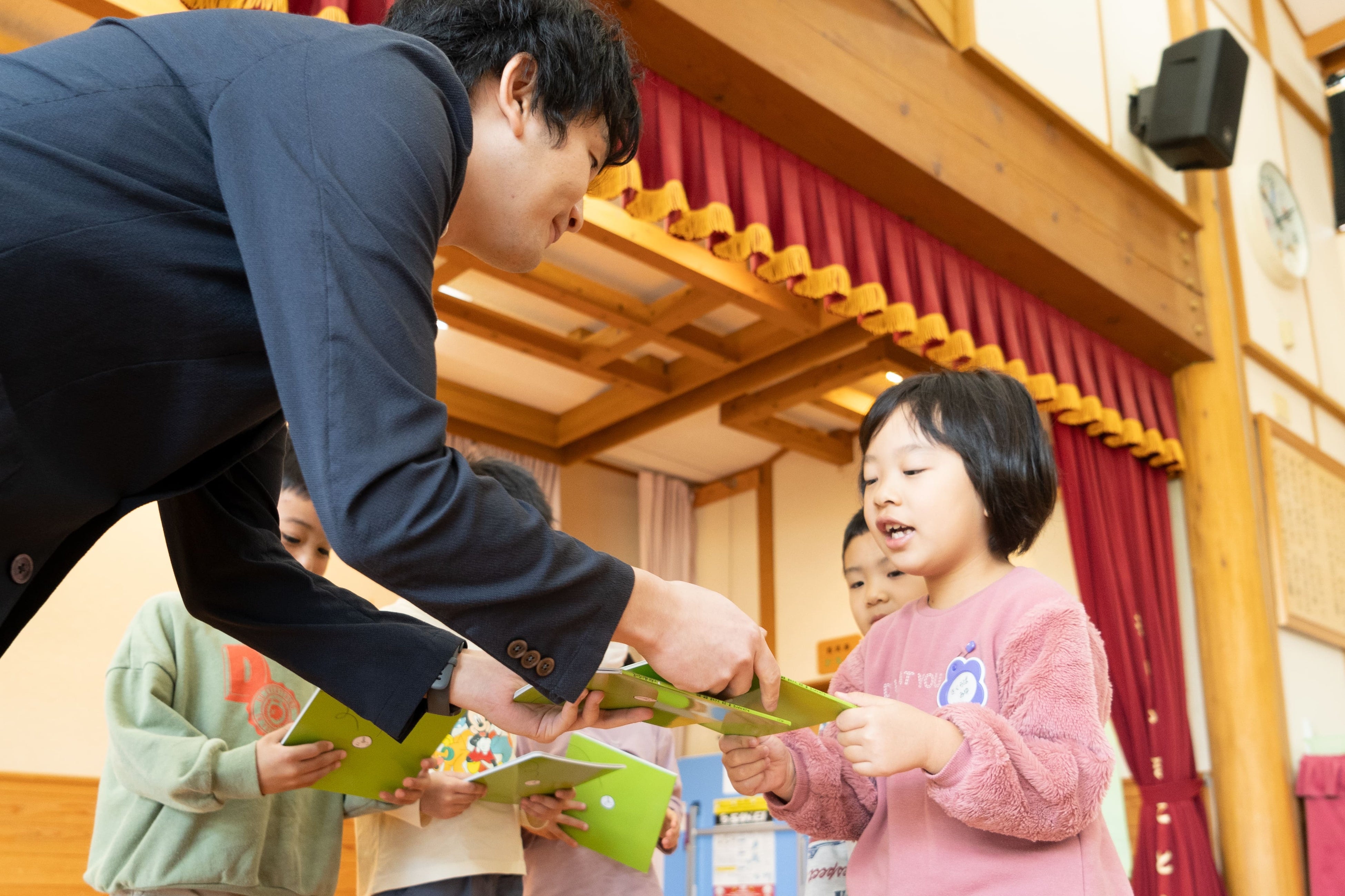 贈呈式で園に絵本が寄贈されたほか、園児一人ひとりにも「ピンピンポンポン」を手渡した