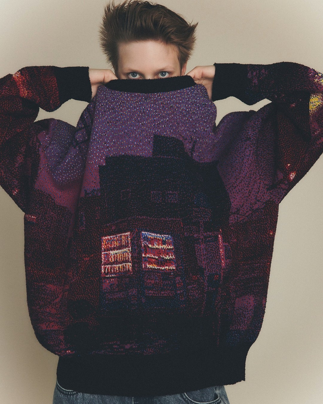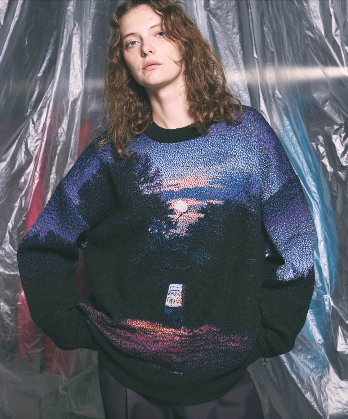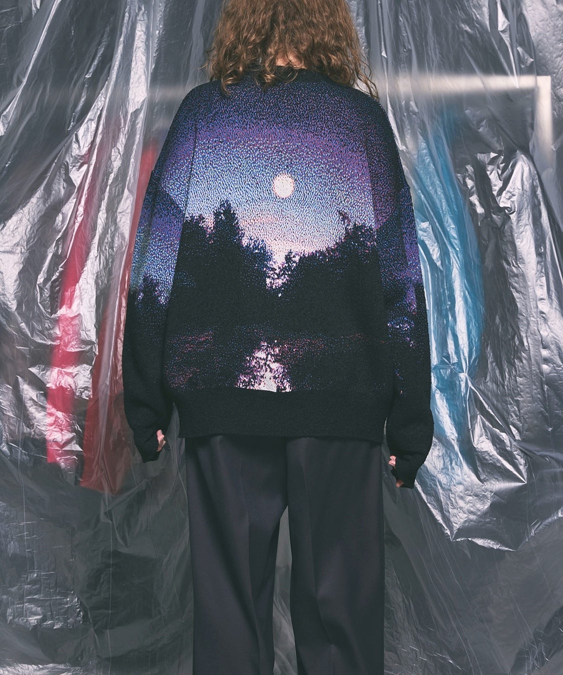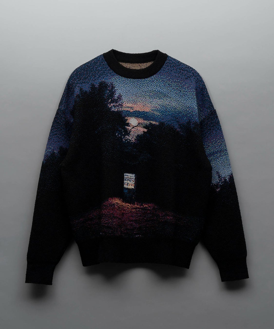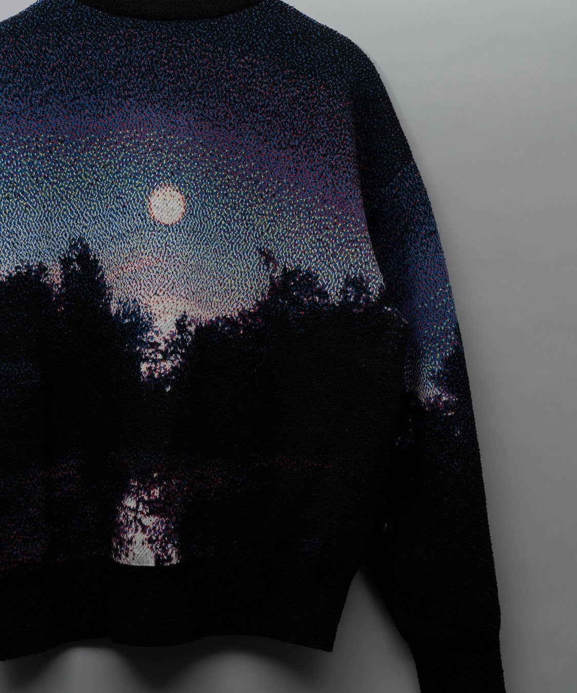 ニットは、点描画のように6色の異なる糸を用いたジャガード編み機で製作。作品の神秘的な光や空気感を再現しながらも、ニットならではの表現を追求。肩や袖の曲線部分にアートワークをどう配置するかに工夫を重ね、着用時の最も自然で美しいバランスにこだわっています。