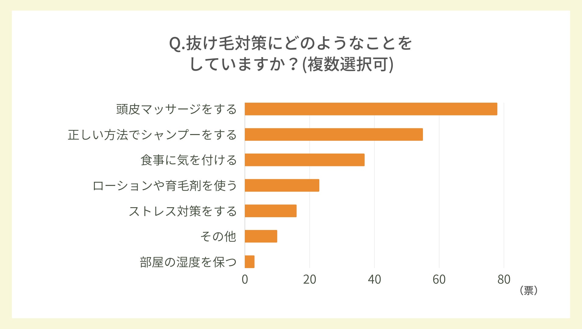 今回、アンケートで皆さんがおこなっている抜け毛対策を伺いました。その結果とともに、秋の抜け毛予防に効果的な方法をご紹介します。