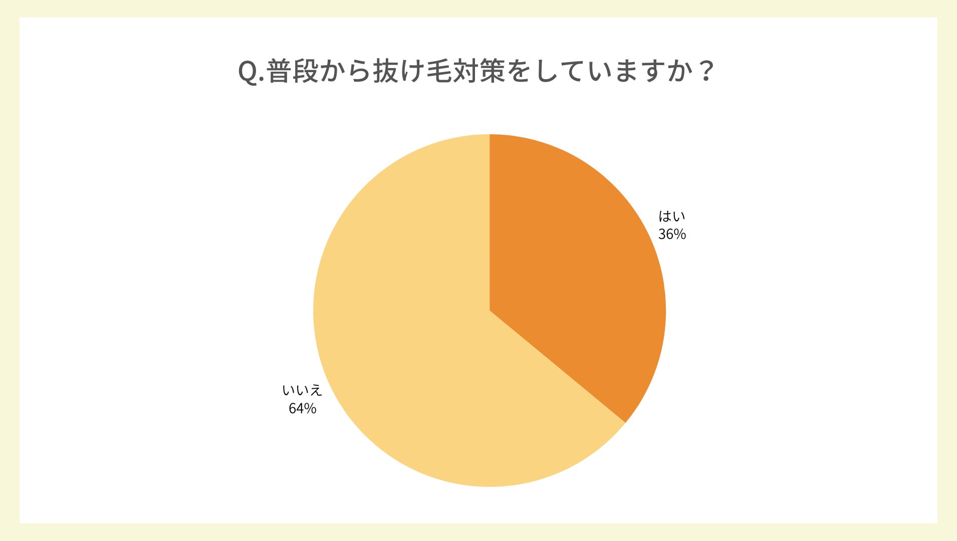 今回のアンケート結果によると「普段から抜け毛対策をしていますか?」との問いに対し「はい」と回答した方は全体の36%でした。