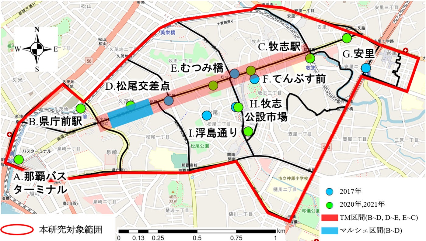 そこで本研究は、①地点別訪問率、②観測地点数、③滞在時間、④通過時間の4つを評価指標として設定するとともに、IoTデバイスデータ、具体的にはWi-Fiパケットセンサーのデータに着目、これを用いた人流計測手法により、沖縄県那覇市中心市街地を対象に行われた活性化施策の効果を明らかにすることを目的に行われた。