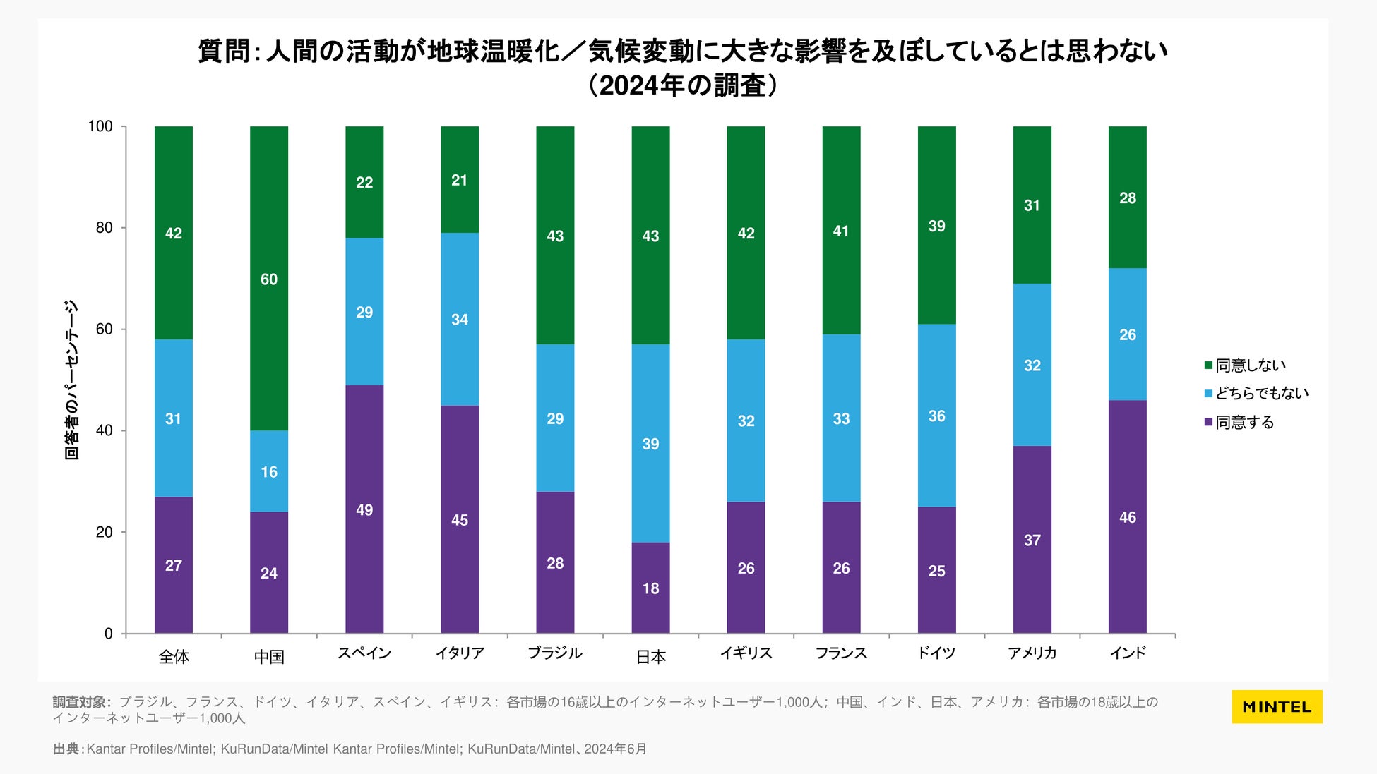 2024年の調査では、日本人は「気候変動否定論者」の割合が他国よりもはるかに低いことが分かりました。「人間の活動が地球温暖化/気候変動に大きな影響を及ぼしているとは思わない」という記述に「同意する」と回答したのはわずか18%で、調査対象10ヵ国の中では最低、また同記述に「同意しない」と回答したのは43%で、中国に次いで2番目に高い数値でした。