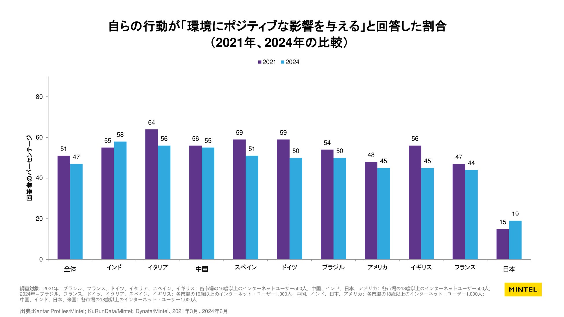 さらに、自らの行動が「環境にポジティブな影響を与える」と回答した割合が日本では、他の調査対象国と比べると2021年で15%、2024年では19%と著しく低い結果になっています(世界の平均は2021年:51%、2024年:47%)。