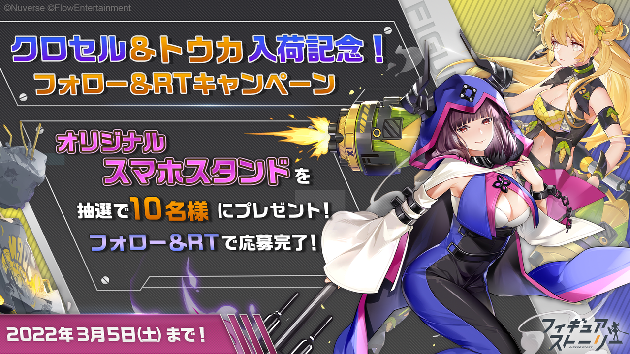 Nuverseは、運営するスマートフォン向け“フィギュアRPG”『フィギュアストーリー(以下ギアスト)』において、2月27日(日)に新フィギュア(キャラクター)の「クロセル(CV:竹達彩奈)」「トウカ(CV:西田望見)」やスキン(着せ替え)、および関連するシナリオイベントを実装いたしました。また、新フィギュア実装を記念したキャンペーンをTwitter上で行います。