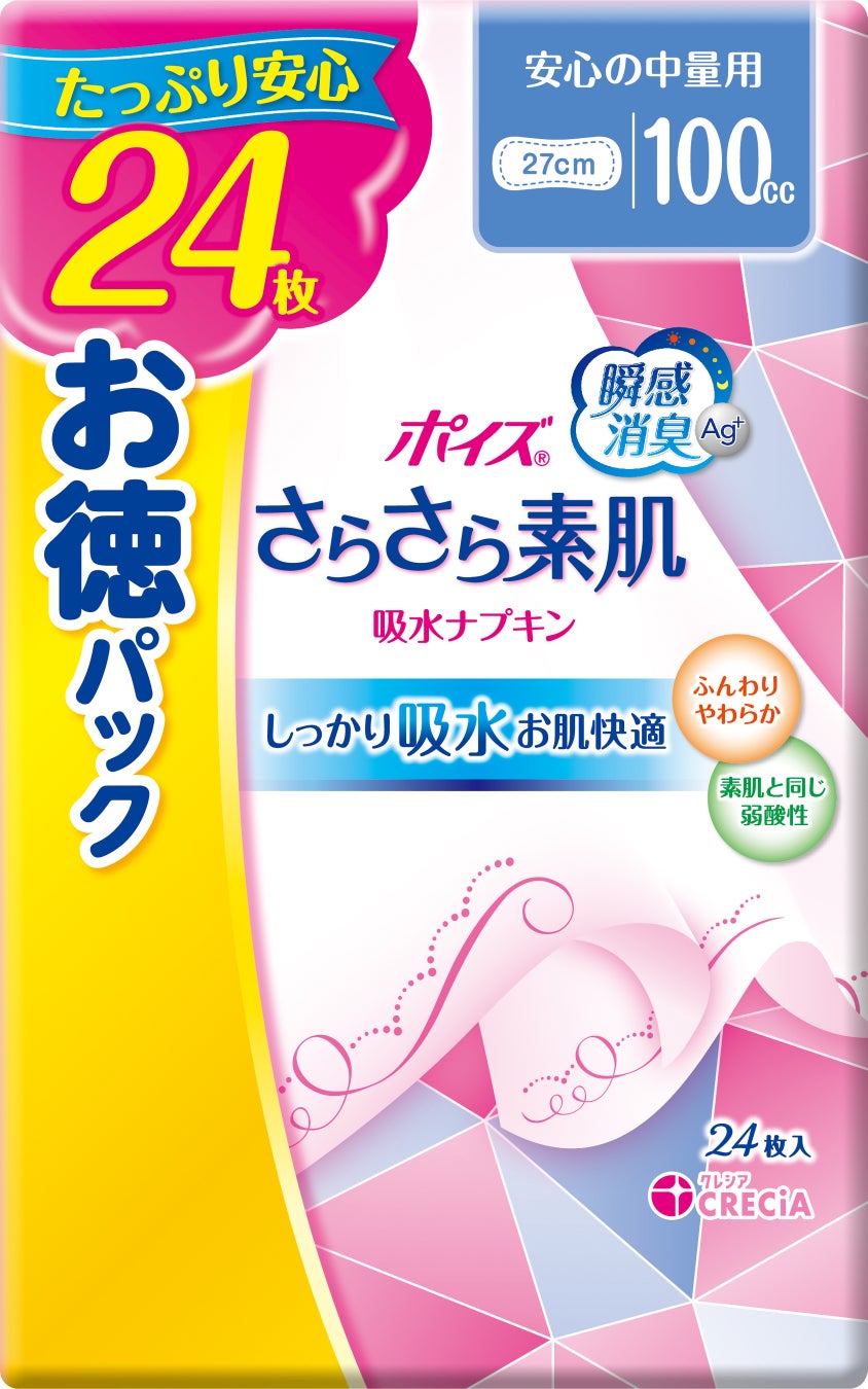 日本製紙グループの日本製紙クレシア株式会社〔住所:東京都千代田区神田駿河台4-6、代表取締役社長:安永敦美〕は、「毎日の下着のケア」や「気軽な吸水ケア」のためのブランド『ポイズ® さらさら素肌』シリーズの吸収量100ccで安心の中量用から通常品の2倍の入り枚数の『ポイズ さらさら素肌 吸水ナプキン 安心の中量用 24枚 お徳パック』を2024年4月1日(月)より、新発売いたします。