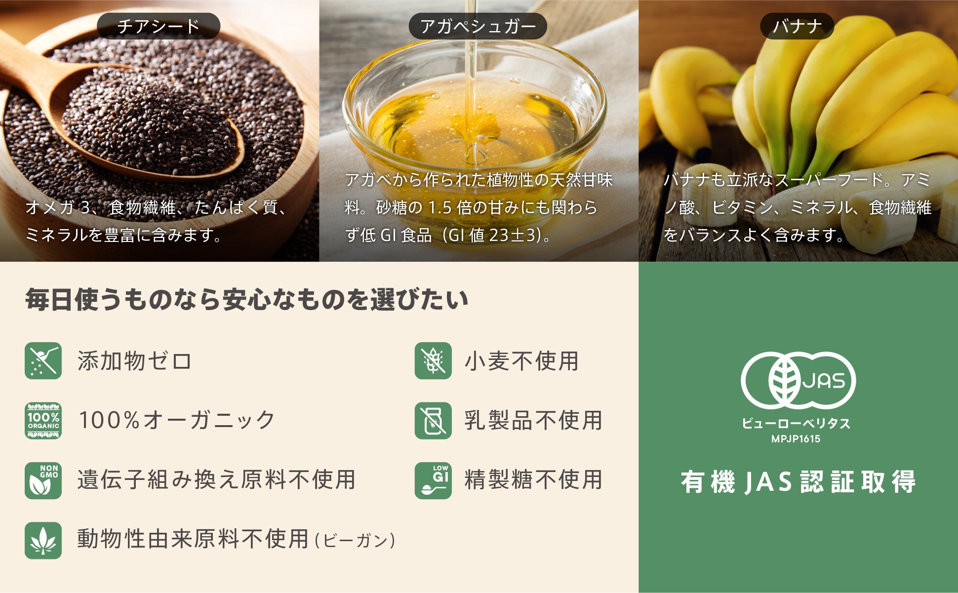 - 精製糖および人工甘味料不使用。甘みには低GIなアガベシュガーを採用